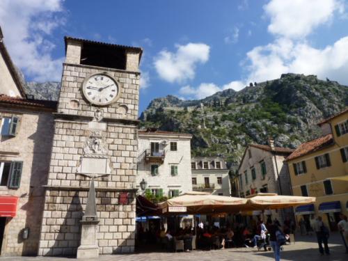 コトルの城壁正門を抜けるとまず目にするのが時計塔。