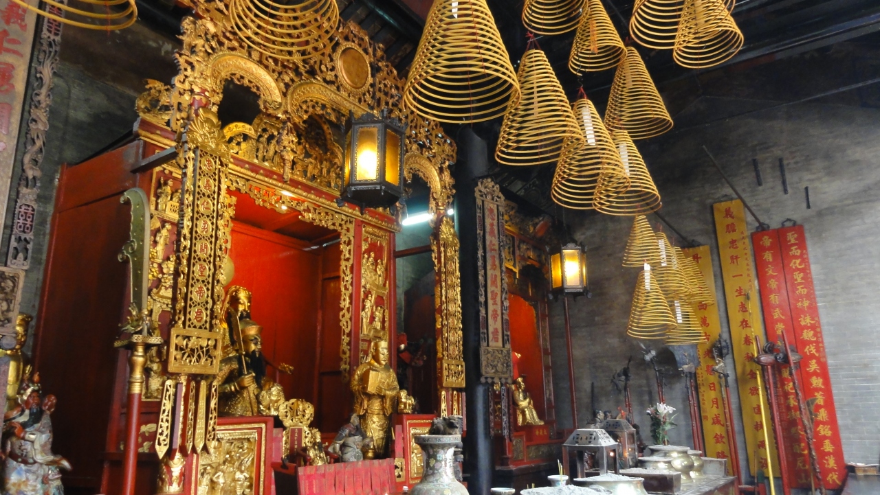 セナド広場から少し入った路地を進むと、三街会館があります。小さなお寺(お堂)で中に入ってみると神様が祭られています。お堂の天井からは渦巻型の線香がつるされており、お堂の中は薄く煙が漂っており、独特の雰囲気です。観光客には掲示版がないと世界遺産とは気が付かないと思いました。
