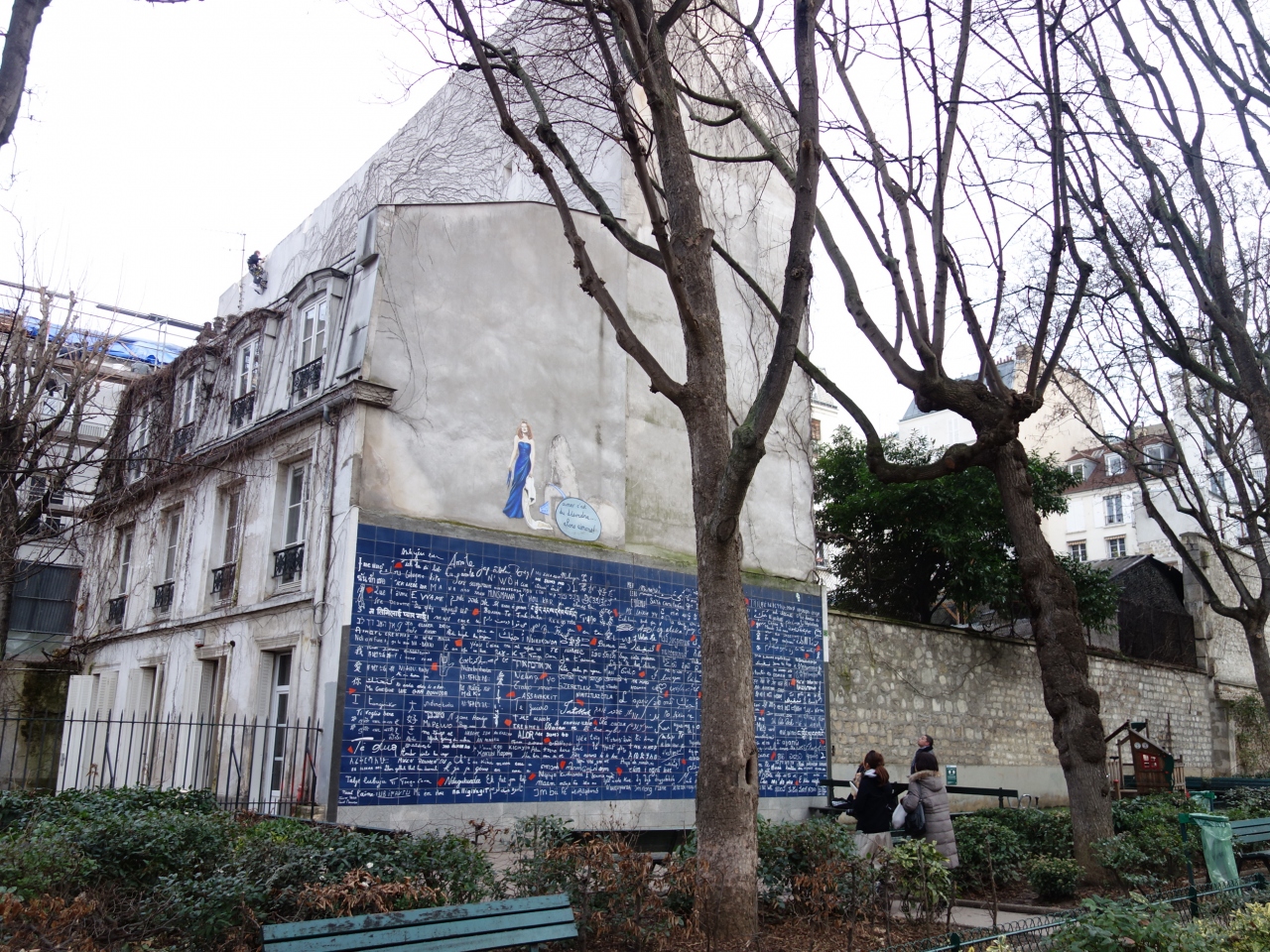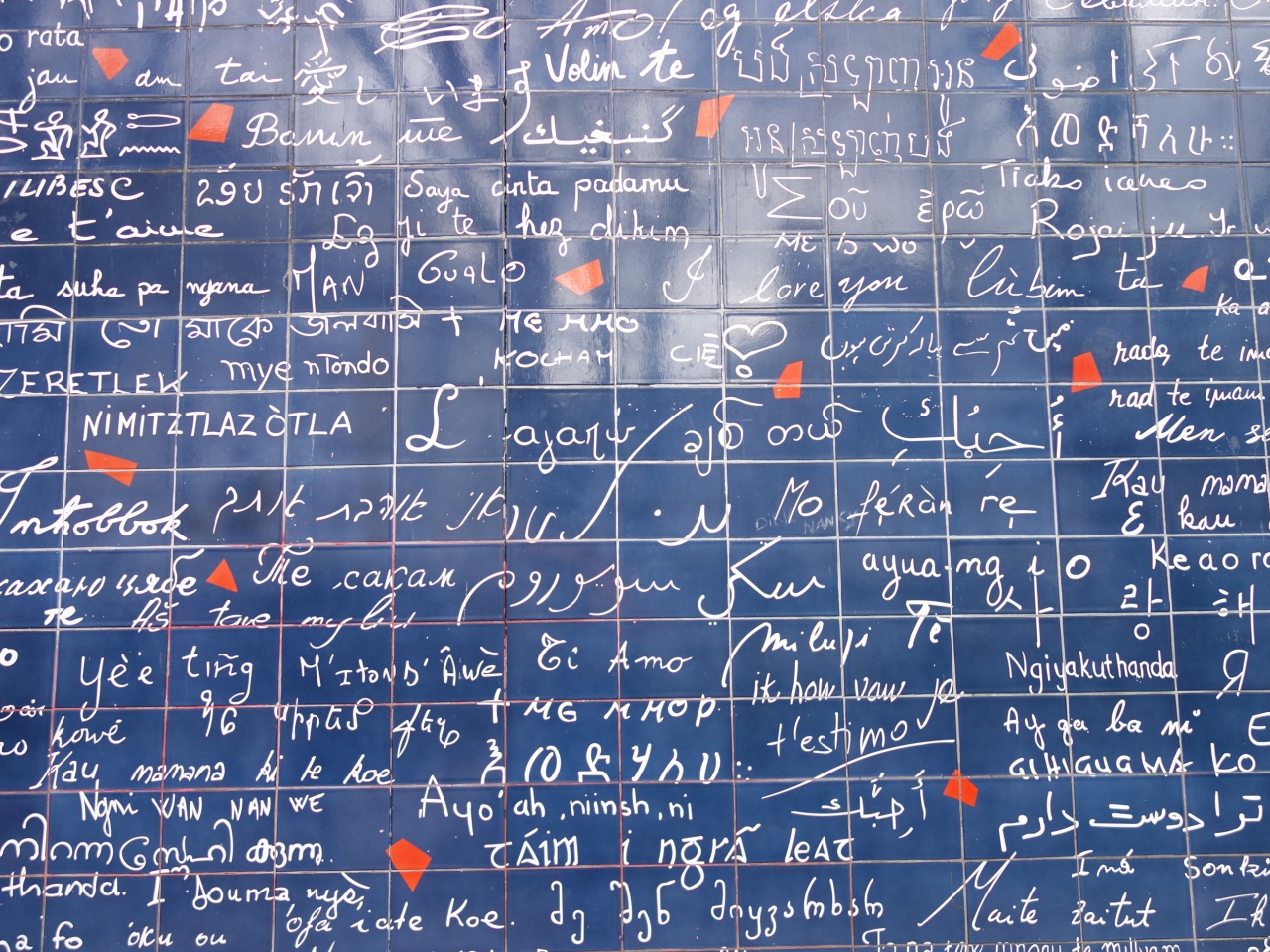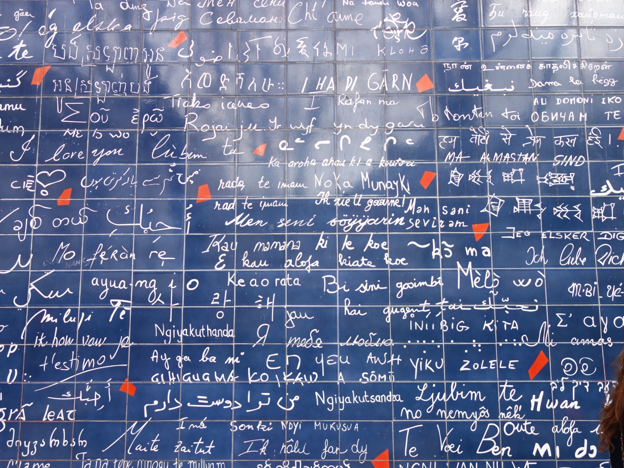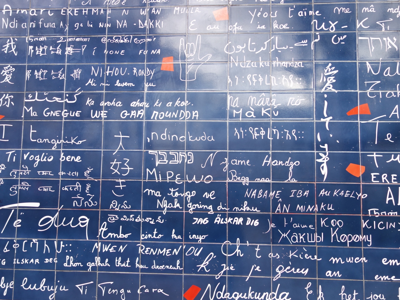 アベスのメトロの駅をあがり,外に出るとすぐそばにこの壁があります。小公園の一角です。たくさんの言語でかかれています。すなおに,I love you とか,Je t'aime といった表示をさがすのには苦労します。なかなか言葉は難しいですね。