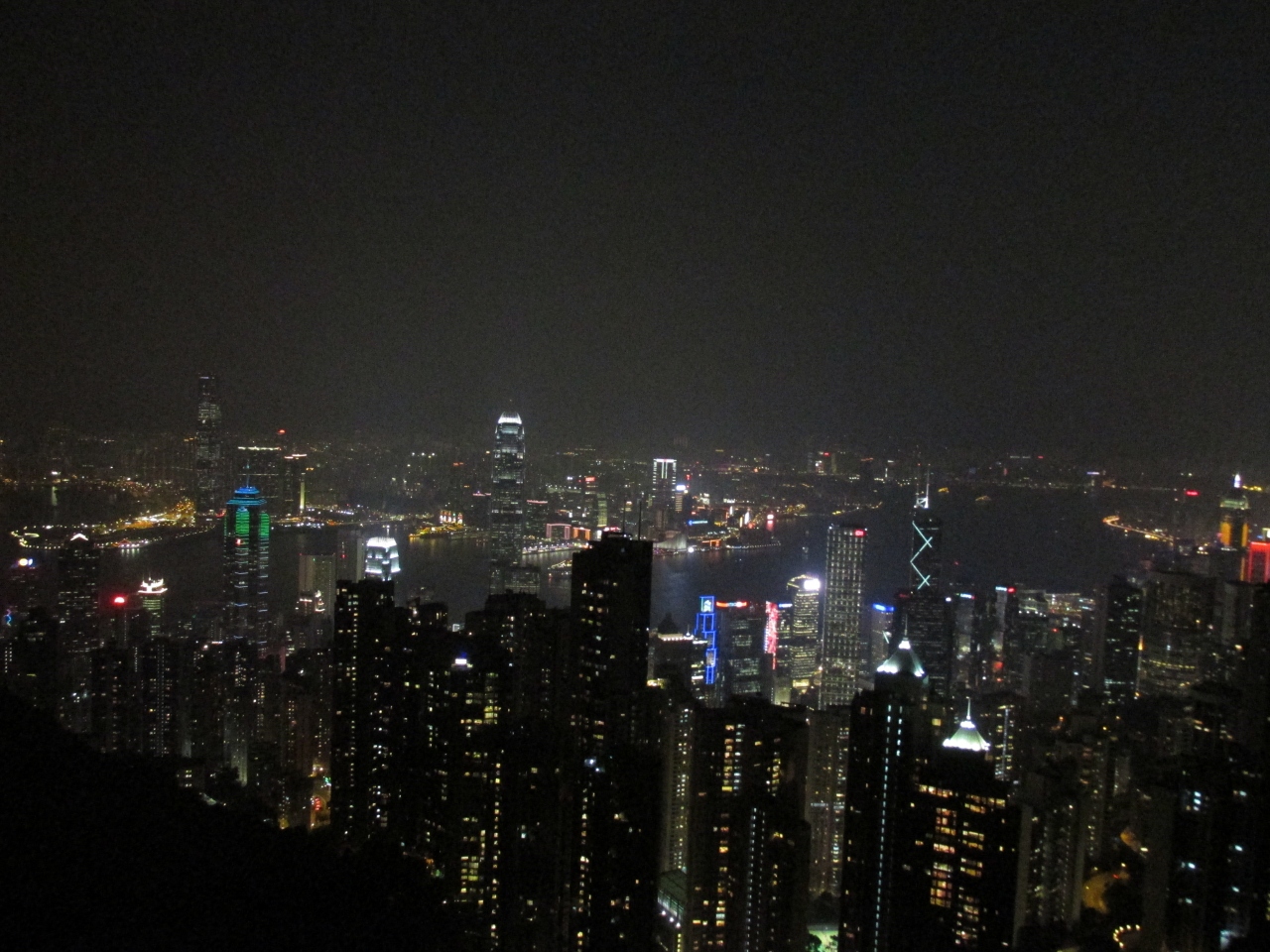 夕方の6時をかなり回った頃、中環フェリーターミナルからのバスに乗ってビクトリアピークを目指しました。のること50分で着きましたが、やはり人は多いです。シンフォーニオブライトは山頂から見ても、ほとんど何をしているかわからないくらいです。お店は食事どころなどいろいろあります。同伴者は靴を購入しました。