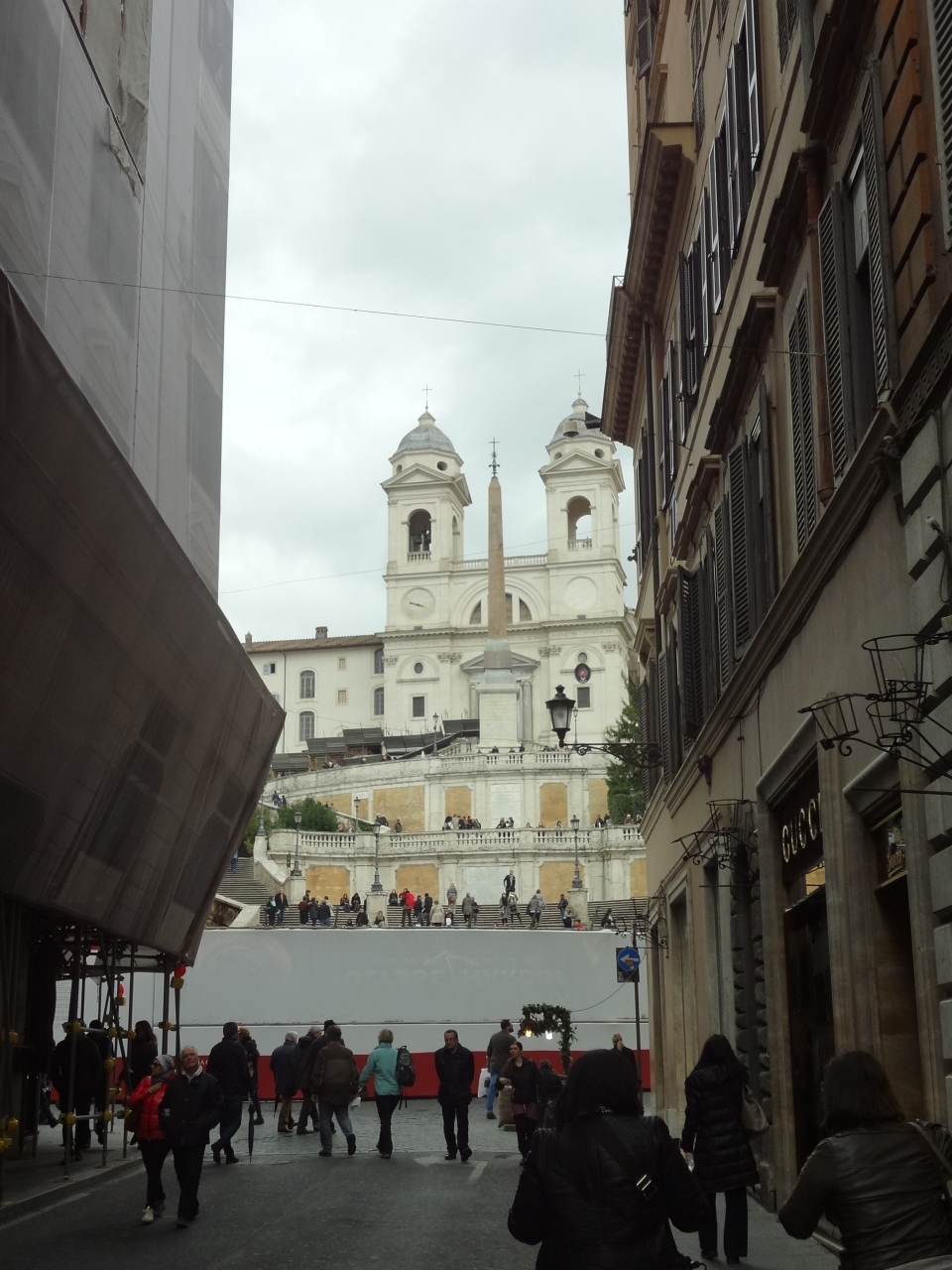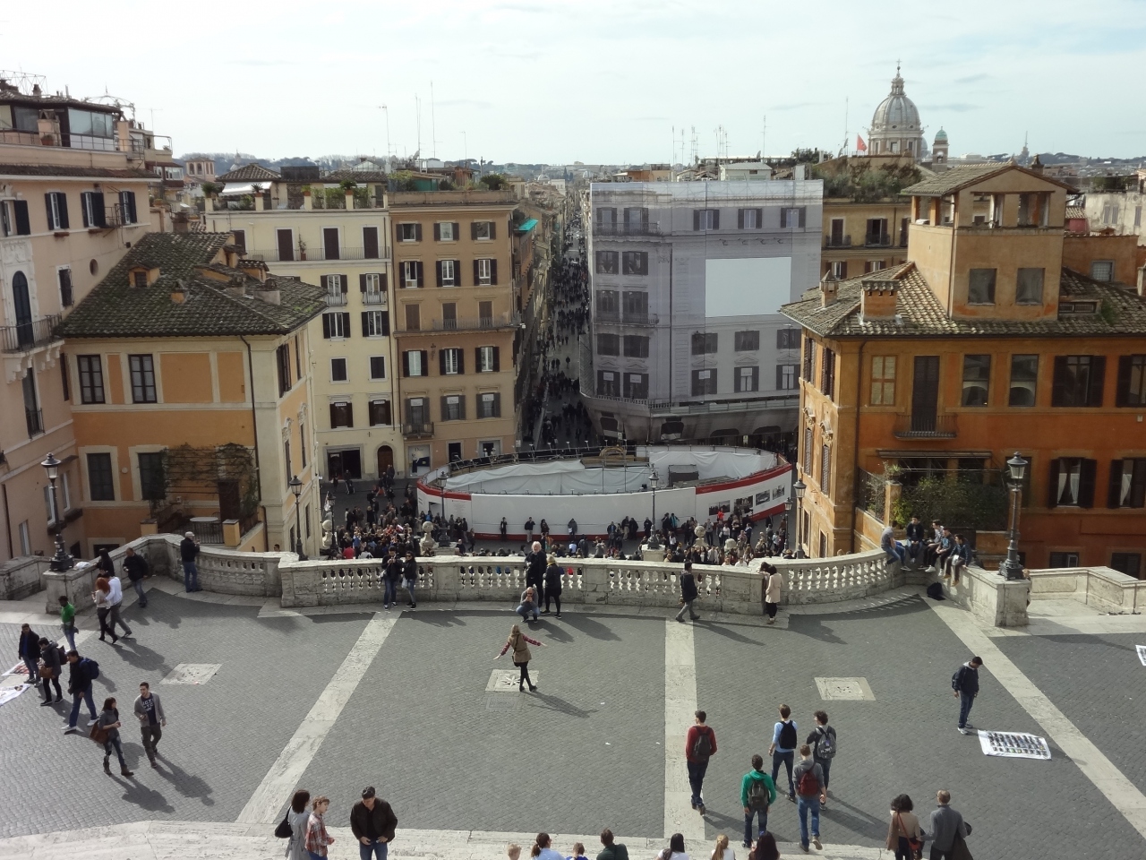 2014年2月、スペイン階段の下にある舟の噴水は、周囲を工事用フェンスに囲われていました。スペイン階段の上から見下ろすとちょっと不細工でしたが、フェンス前からスペイン階段を見上げた風景は同じでした。次回はフェンスの無いスペイン広場を見たいです。