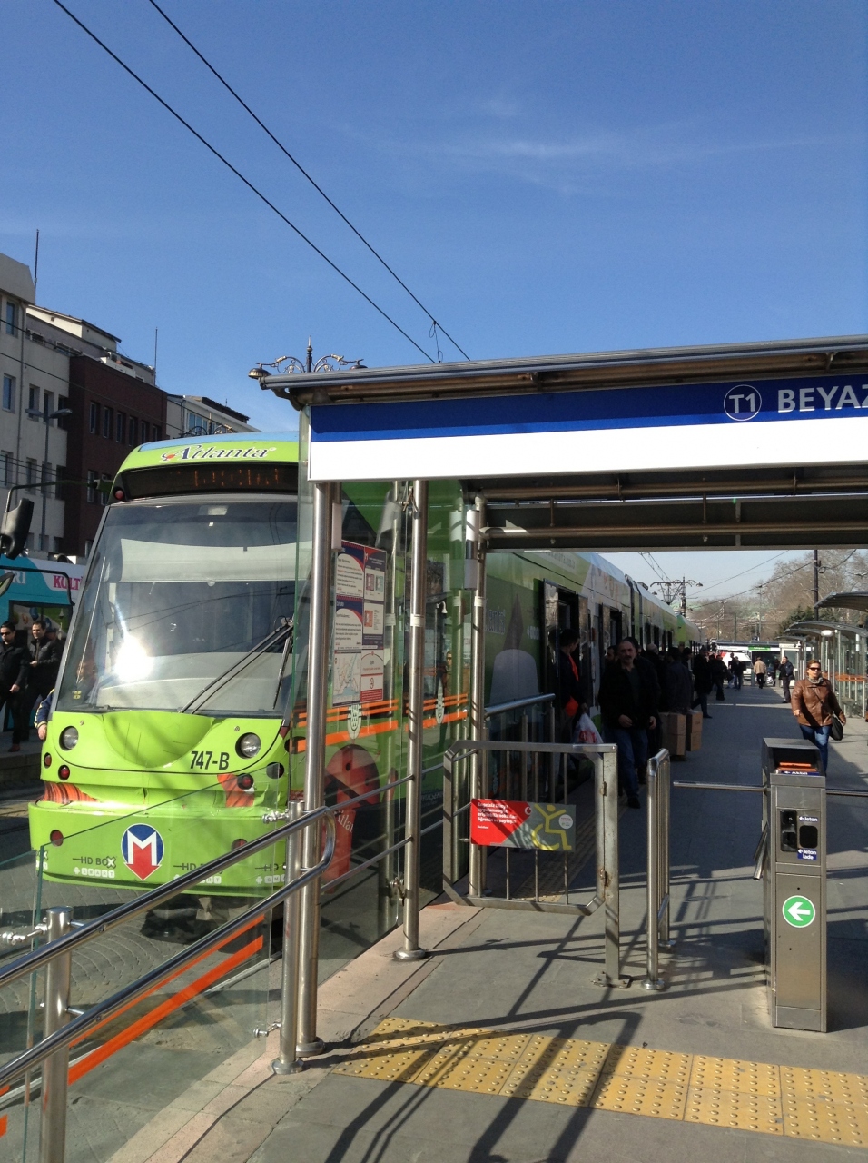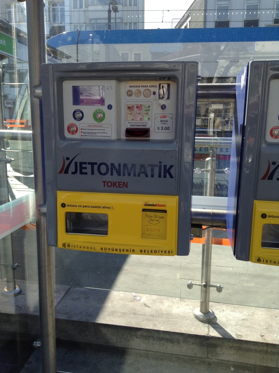 ホームの外に券売機があるので、ジェトンというコインのような切符を購入します。2014年2月現在、3トルコリラでした。値上げしたようです。ジェトンは改札で投入します。(返ってきません) 観光の移動に便利でした。