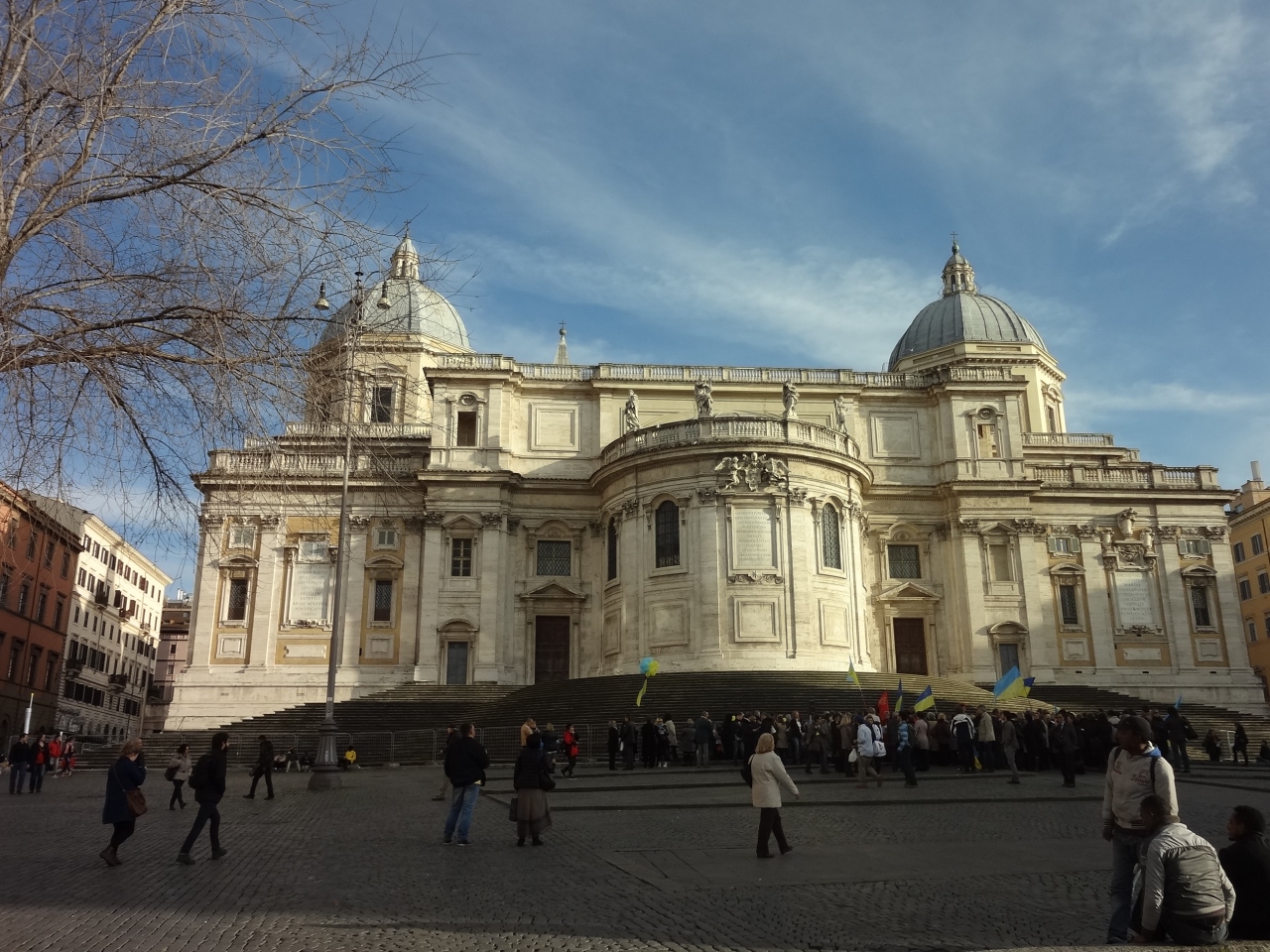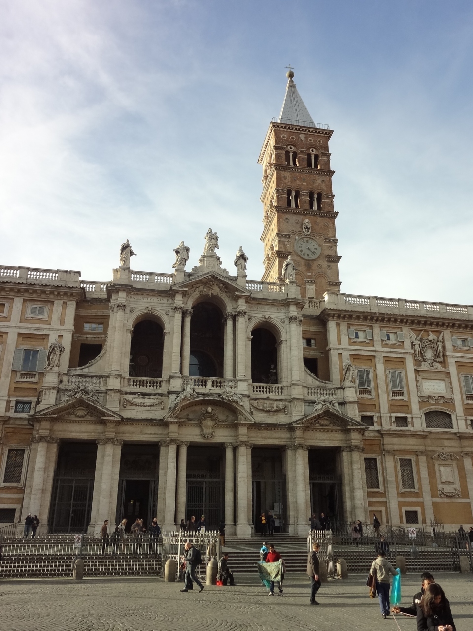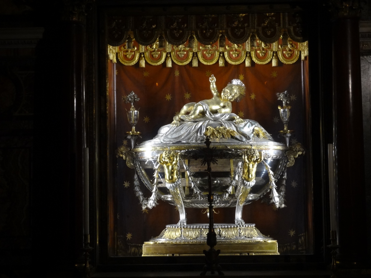 宿泊したホテルの近くにあり、毎日のように後陣の前(エスクイリーノ広場)を歩きました。よく歩いた3本の通りの正面に教会の後陣が見え、この後陣が見えるとホテルの近くまで来たことを実感し、安心したものです。教会内は広く、モザイクや絵画が多数ありましたが、私が最も興味を持ったのは地下聖堂でした。ピオ4世と書かれた祈る人の像の目の前には、ガラスに囲われた輝く杯がありましたが、これが聖遺物(キリスト誕生時のかいば桶の木片)に関わるものだったのでしょうか?