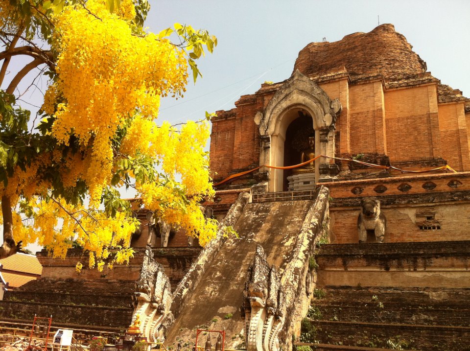 市内にあるお寺の中ではかなり広いです。広い境内の中にあるのは大きすぎて遺跡のような仏塔。仏塔のまわりを象が守護神のように囲んでいます。私が行ったときには黄色い花が咲いており、朽ち果てた仏塔と花の色のコントラストが見事でした。