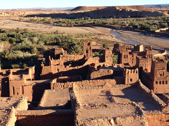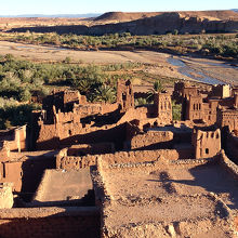 アイット・ベン・ハッドゥは敵の侵入を防ぐため集落への入口はひとつしかなく、丘の上へと続く道は迷路のように入り組んでいます。家の1階には窓がなく換気口のみ、ぶ厚い土壁には銃眼があり、最上階は篭城に備え穀物倉庫兼見張り台になっています。この様な建物が小高い丘の斜面に複雑に重なり合っています。村全体がひとつのカスバ(要塞)に成っています。このあたり一帯は岩塩が採れることもあって、13世紀には塩の交易にやってきたユダヤ人も暮らしていました。村にあるモスクはもともとはユダヤ教会シナゴークでした。1985年までは約2000人ほどがこの村に暮らしていましたが、現在、居住している住人は5家族だけです。ほとんどの住民は対岸の集落に移住しています。