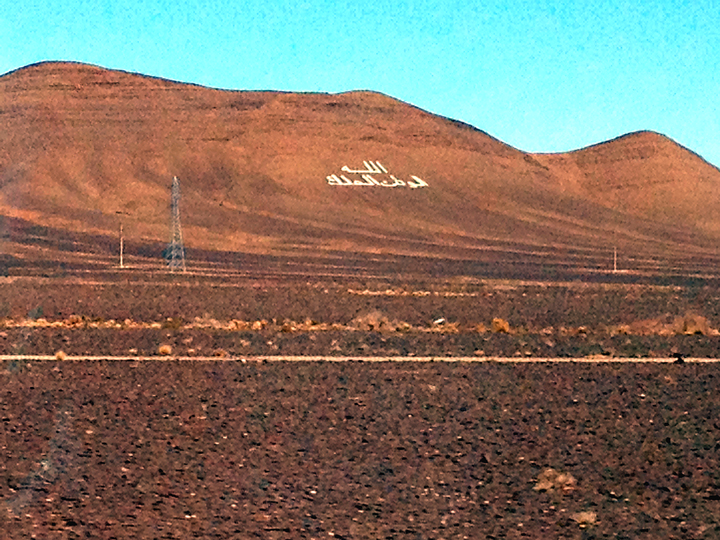 モロッコには国花は存在しませんが、国のナショナルツリーはモロッコ人的にはアルガンの木と思っているそうです。モロッコには国花の替わりにナショナルワードというのがあります。町の周辺にある小高い丘などに、その言葉がアラビア語で描かれています。三角形で上が「神」、左が「国(民)」、右が「国王」を意味しているそうです。
