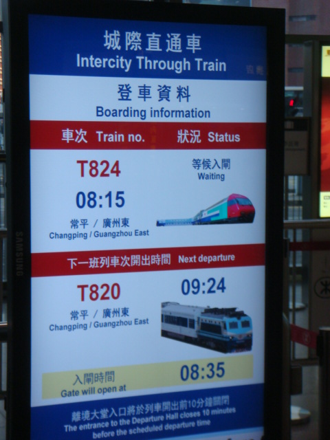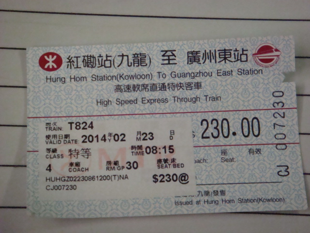 香港:紅ハム駅から広州までの移動に使用しました。1日に12便走っていますが、香港側の車両が綺麗でお勧めです。切符はMTRのサイトに登録すればインターネットでクレジットカード(カードによってはエラーが出ることもある)を使用して事前購入が出来、購入したクレジットカードを受付に出すと切符をもらうことが出来ます。(ただし切符の受け取りは広州東駅では出来ず、紅ハム駅でしかできない。またネット購入は手数料が6HK$必要)。私は香港車両の特等を利用しました。出境カードを書かずに有人レーンに並んでしまい、書くように言われました。ミネラルウォーターとクラッカー2枚入りの袋をもらいました。座席の前網に軽食や観光チケット、お土産などの案内がありました。