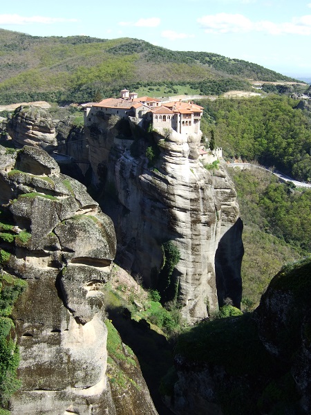 道路から少し上がったところにある大メテオロン修道院から望むヴァルラーム修道院の眺めが素晴らしいです。