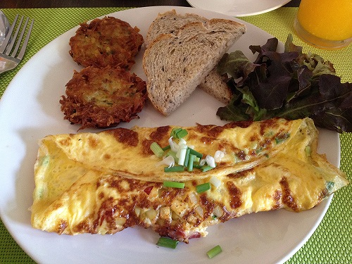 まず驚いたのはセットメニューの値段が安い!いちばん高いセットでも150バーツ(450円)(トースト、オムレツ、ハッシュブラウン、レタス、オレンジジュース)、特にオーナーシェフお手製のハッシュブラウンが美味しい!