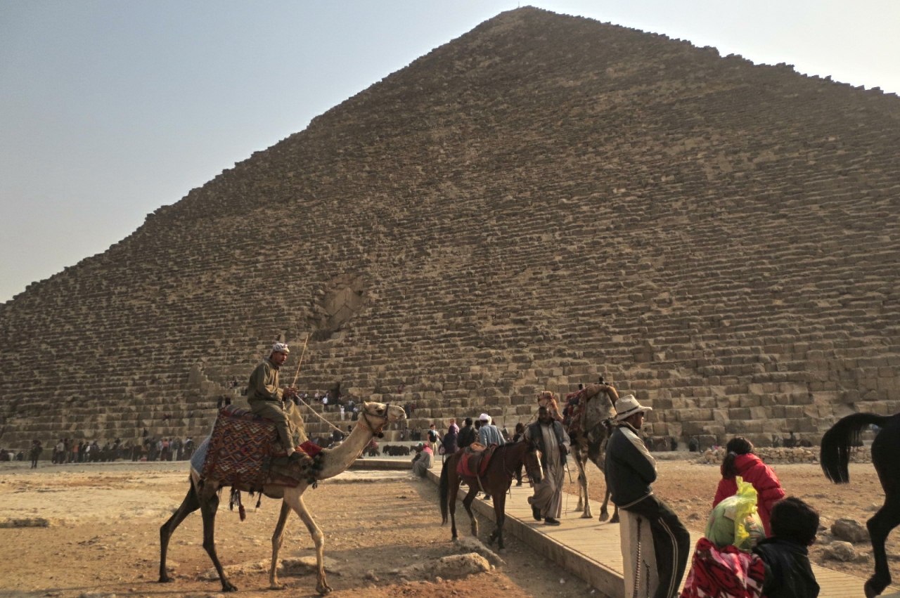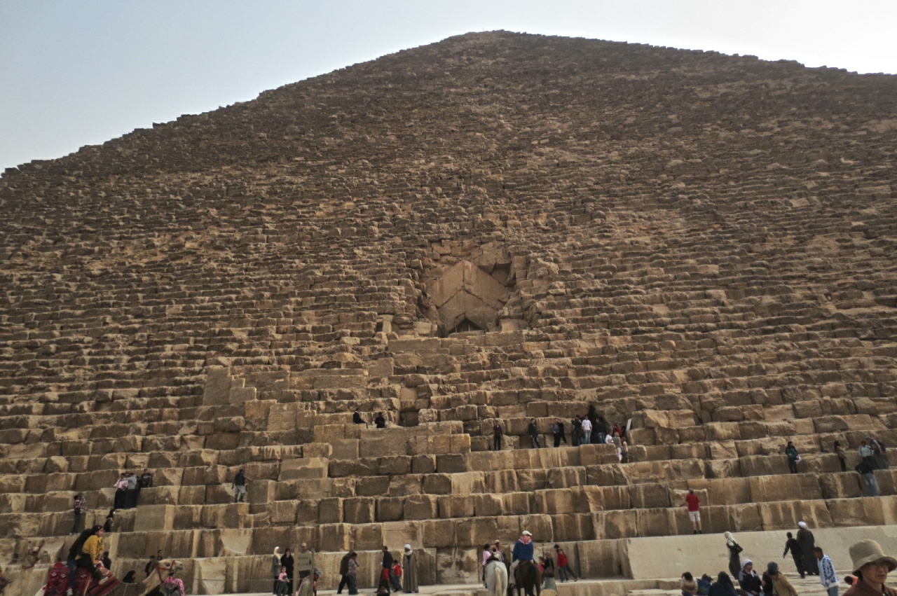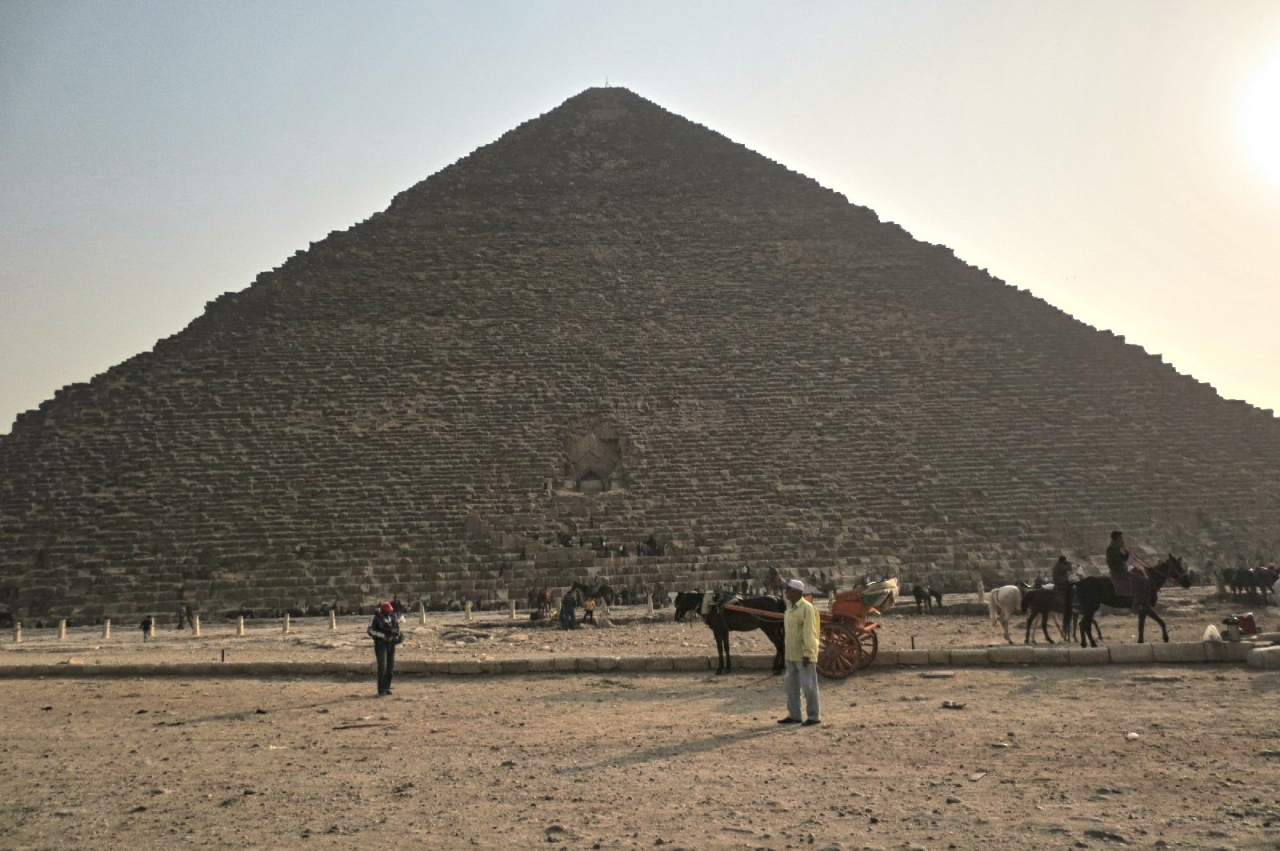 ギザにある3つのは三つのピラミッドのうち一番大きいのがクフ王のピラミッドです。頂上の鉄の棒は、元の高さ146m(現在137m)を表しています。