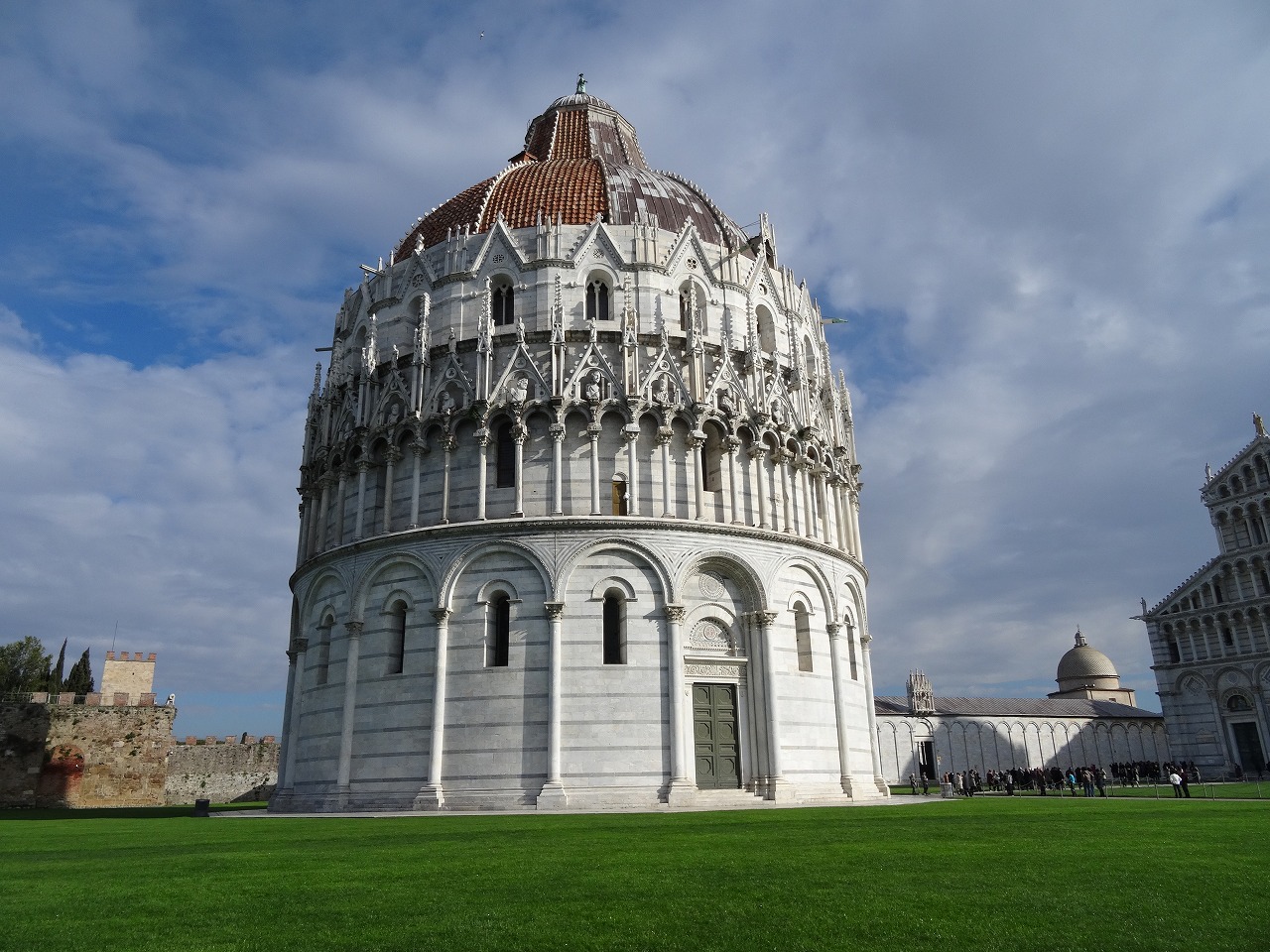 ピサ 洗礼堂 入口から入って、まずあるのが、この洗礼堂。続いて、大聖堂(ドゥオモ)、いよいよ斜塔となります。洗礼堂への入場券は、納骨堂、美術館などと併せて、1館入場で5ユーロ、2館で7ユーロでした。外からだけでも充分美しいですが、中のガリレオの洗礼盤≪13世紀)は、見逃せません。