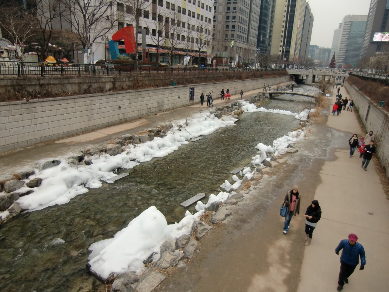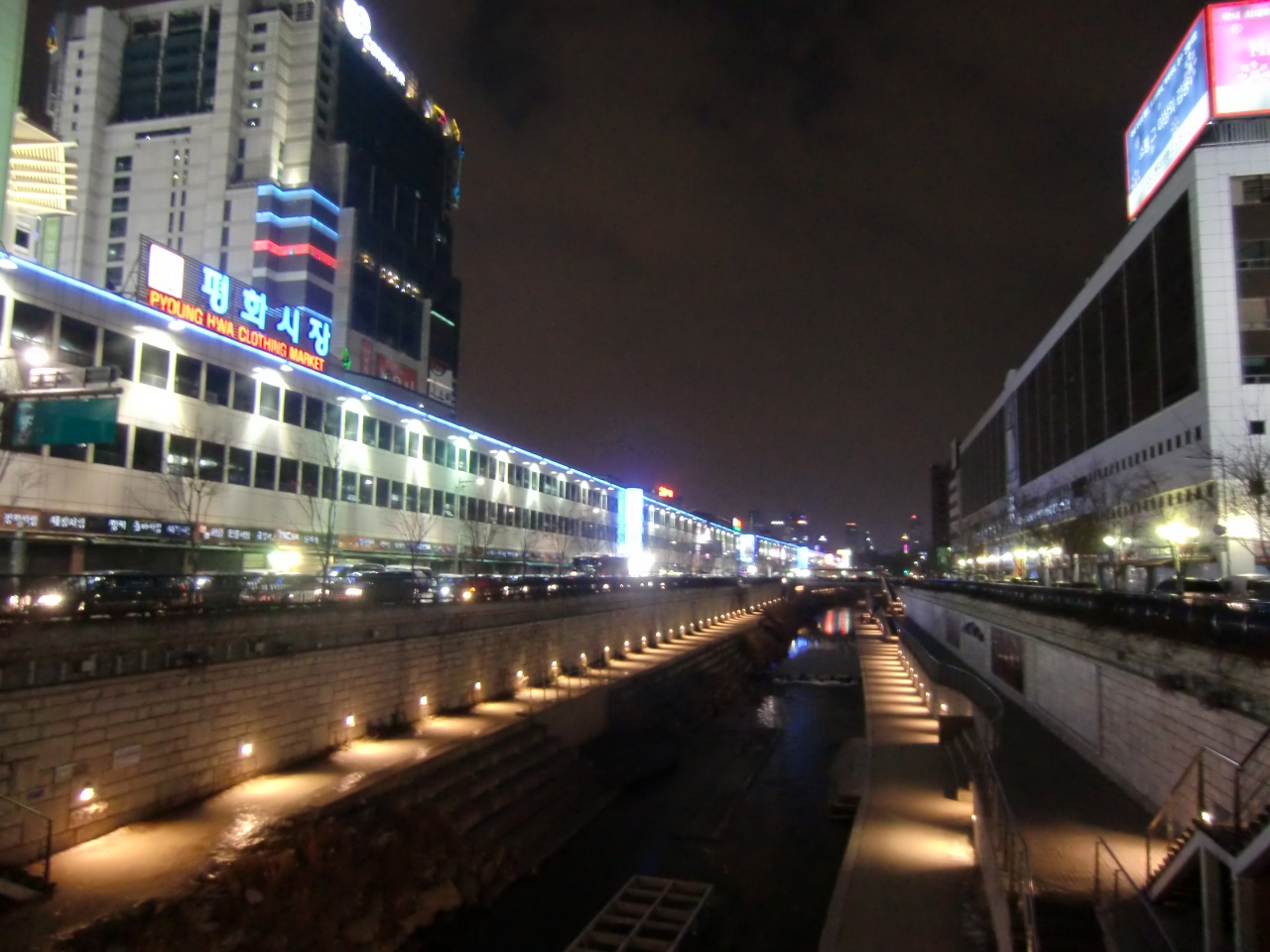 長い水路の大半(東大門~鐘閣あたりまで)は特にライトアップもなく普通の水辺の散歩道といったところですが、きれいに整備はされています。