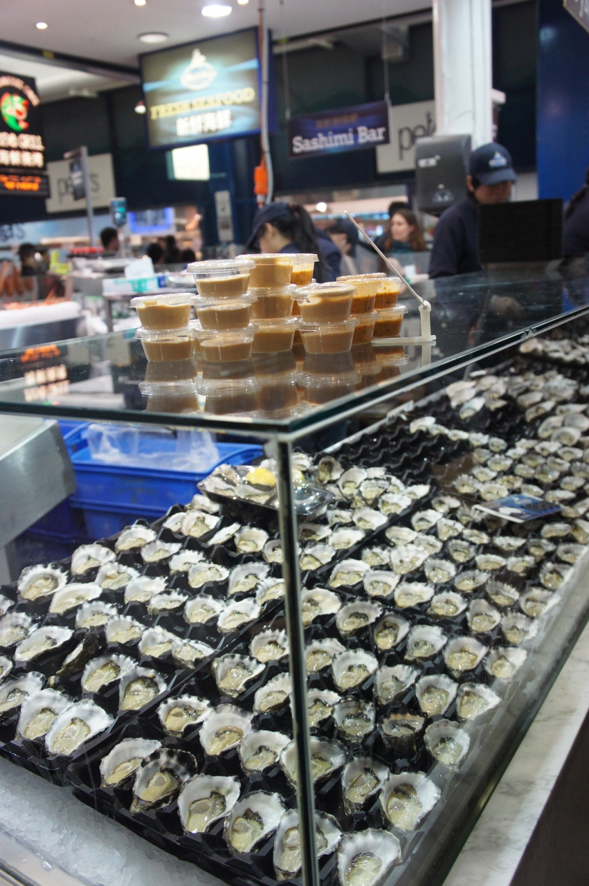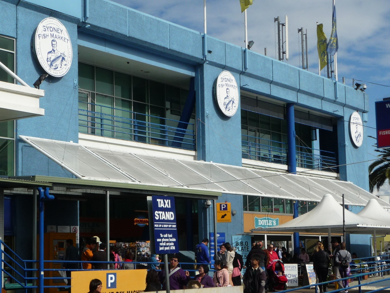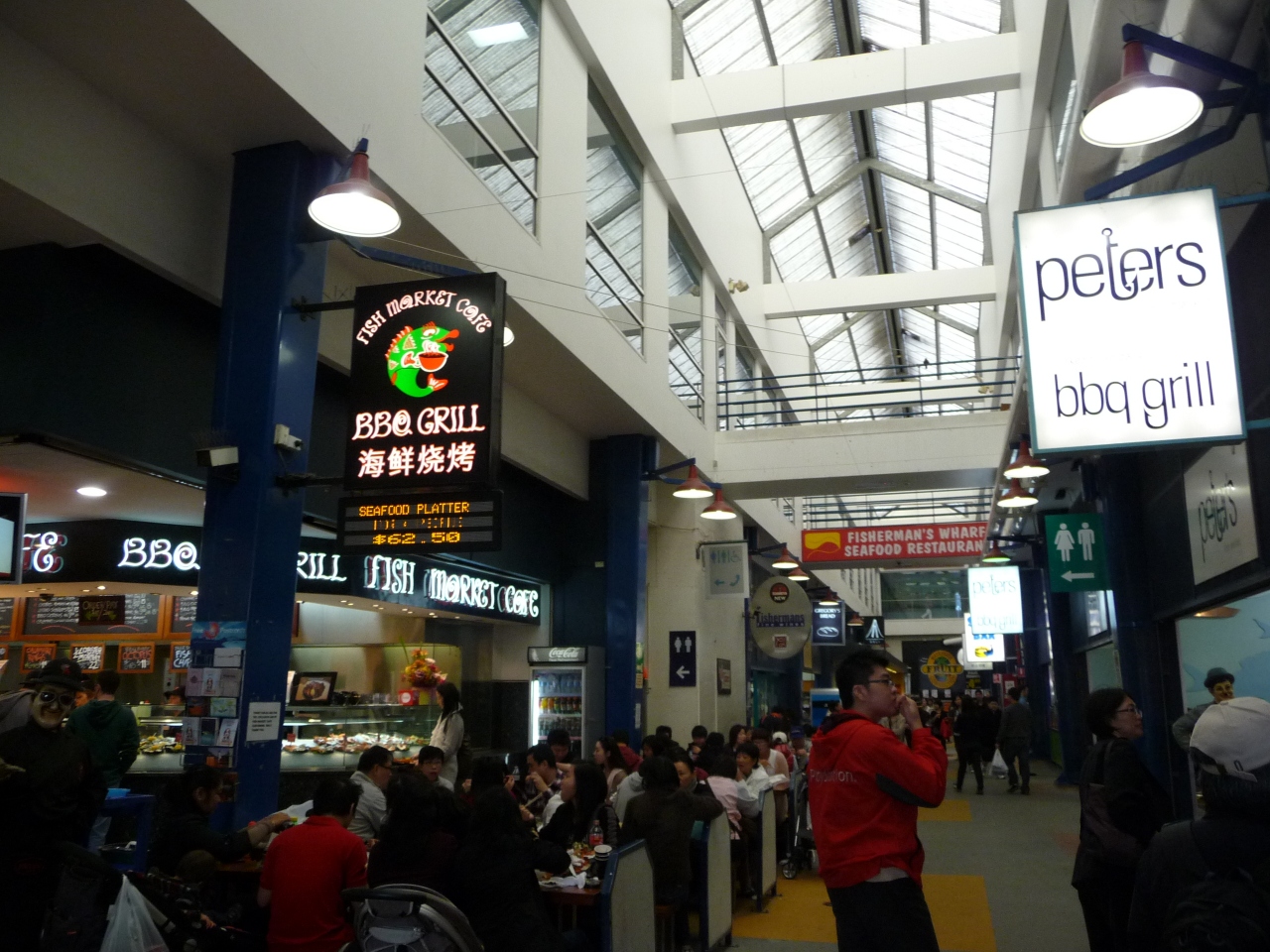 シドニーの台所、駅から歩いてすぐ。市場の中にはいくつか建物があるが、一番大きい建物にはその場で買って食べられるスペースがある。生ガキをその場で開けていたり、刺身を切ってくれたりする。カキは種類があり、半ダース単位で買える。醤油やワサビは別料金。同じ建物の中にワインなどを売っている店もあるのでプラスチックのグラスも一緒に購入すればテーブルと椅子があるところで食べることができる。ただし、食べるスペースは自分たちが持ち込んで食べるだけであるのでごみも多くお世辞にも快適とは言い難いです。気軽に食べられるスペースではあるが。果物やナッツ類を売っていたりヨーグルトなどのお店もあります。