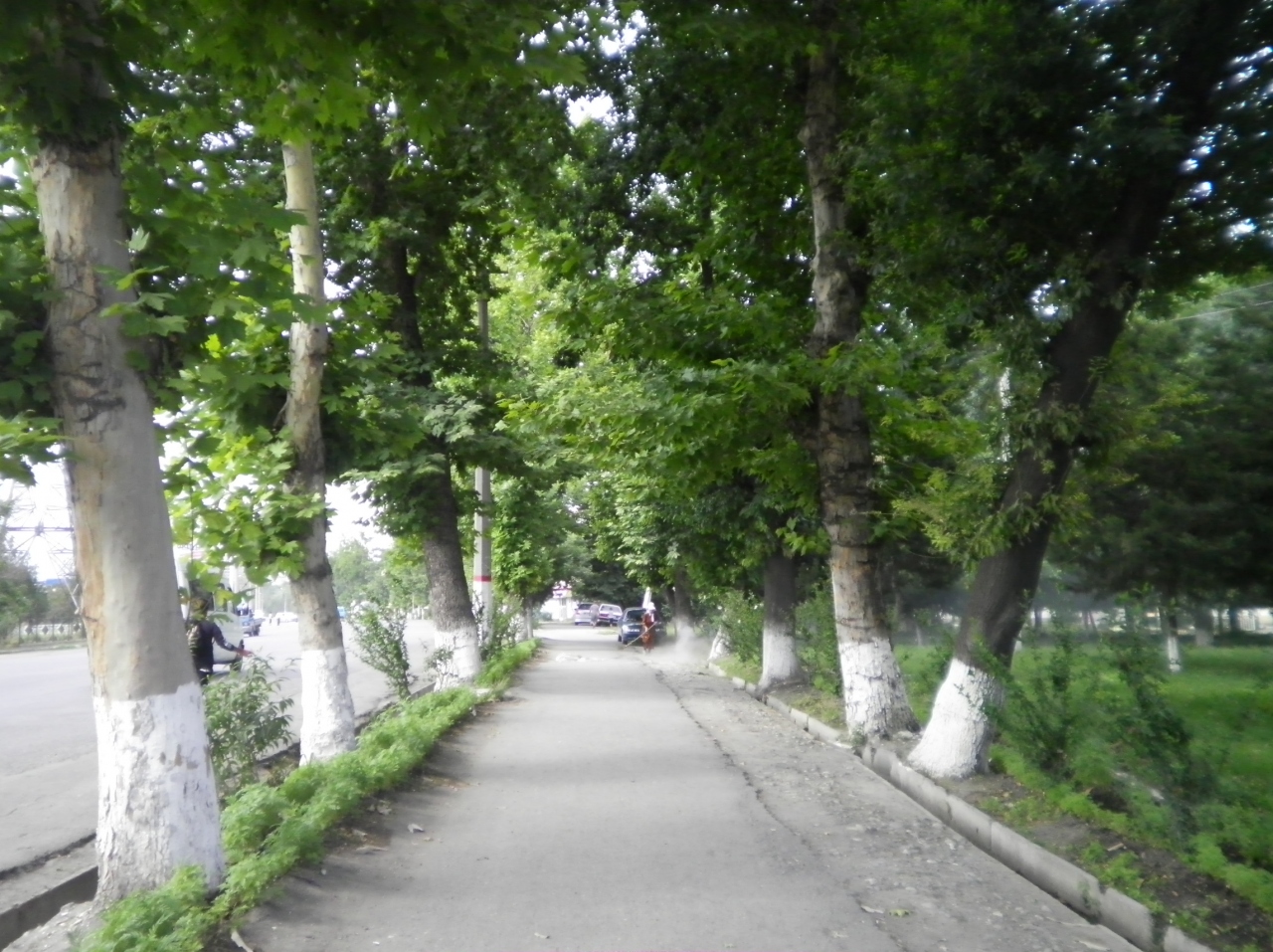 立派な木々の並木道、雪解け水の小川沿い、緑の林、トロリーバスが走るオシュ・ラザコフ大通り。