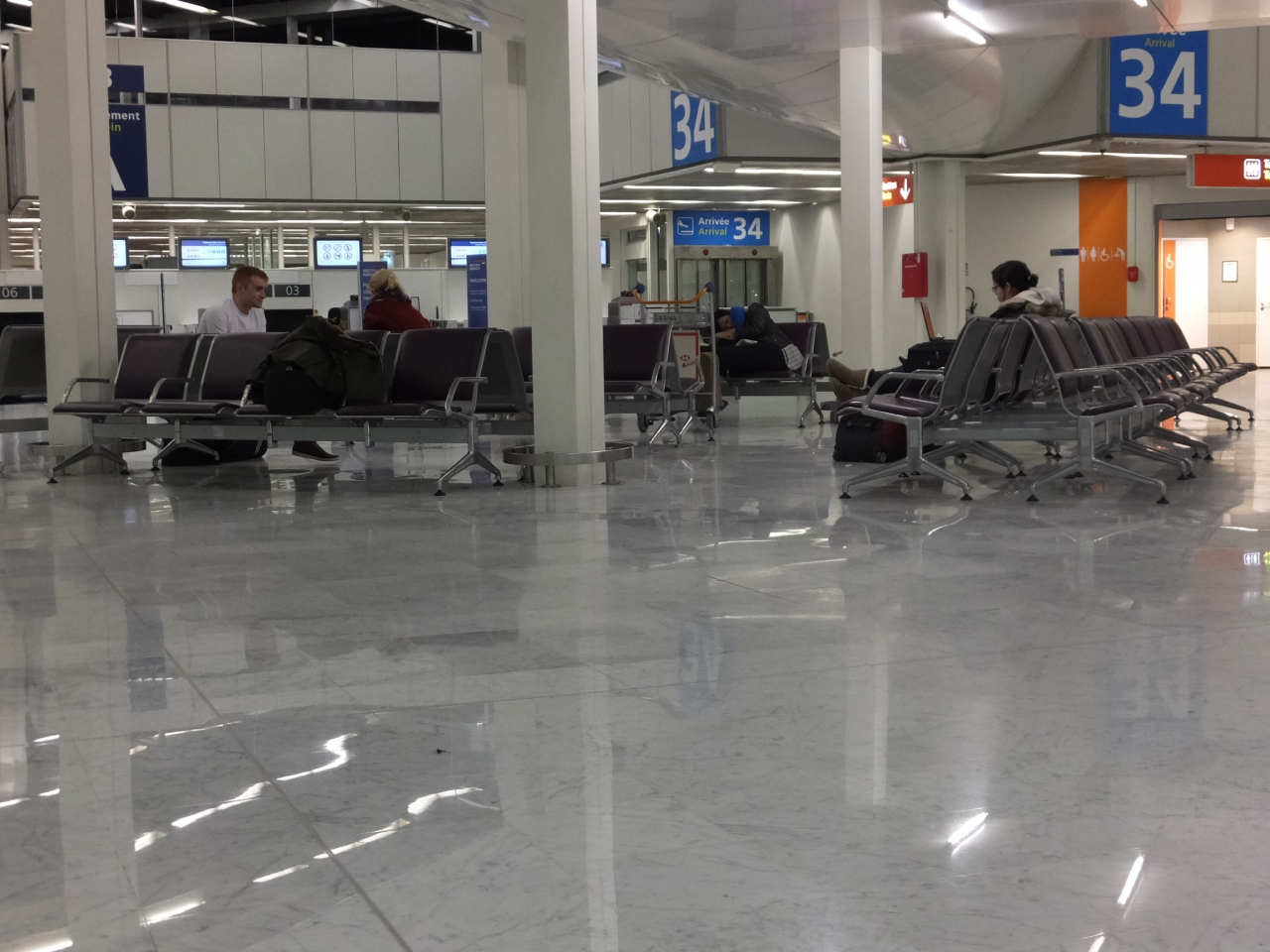 が、結局ロンドン-オルリー行きで乗れたのが最終便で、それもディレイして着いたのは23時過ぎ。翌朝9時前のニース行きに乗りたかったので、いろいろ検討し、オルリー空港(西ターミナル)内で夜明かしすることにしました。