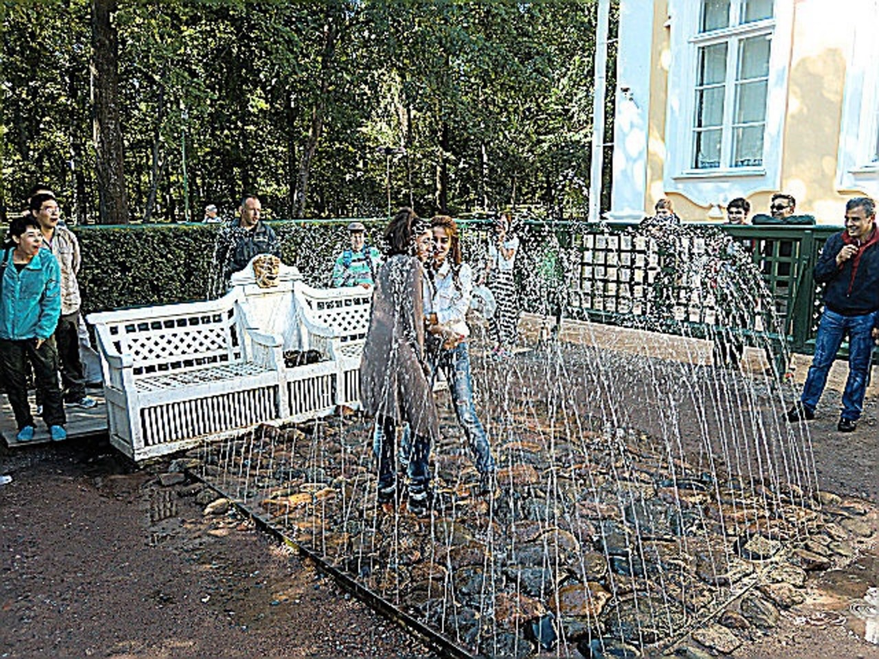 何箇所か設置されていますが、イスの前を通ると自動的に水が吹き出して濡れてしまうと言う趣向の変わった面白い噴水ですが、イスの後ろで係員が操作しているようです…