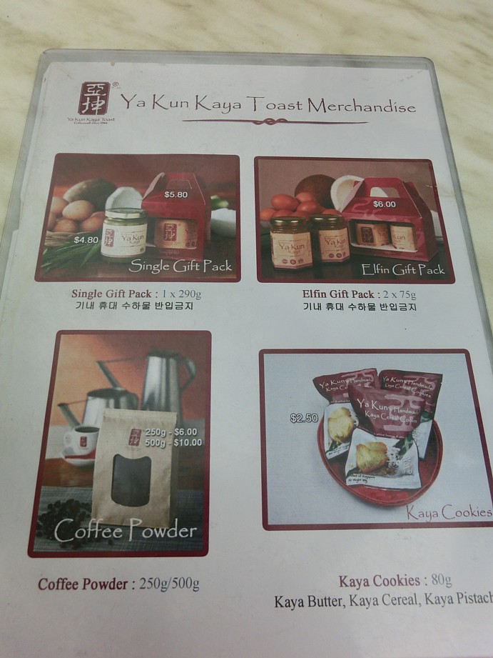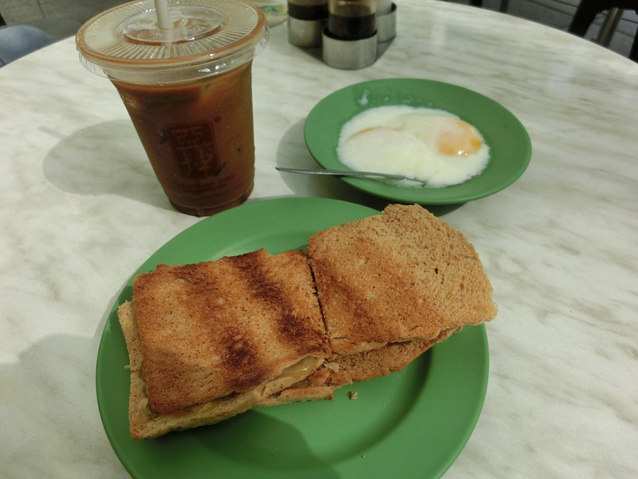カヤ・トースト・セット(トースト2枚、温泉卵2個、コーヒーまたは紅茶)はホット・ドリンクなら4.20Sドルで、コールドドリンクなら4.70Sドル。