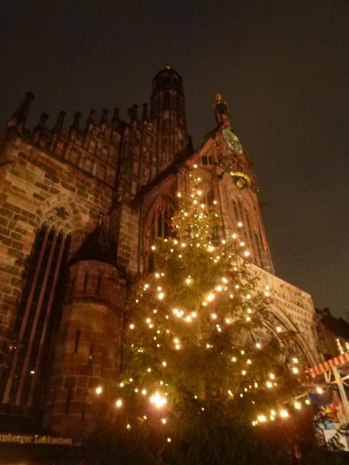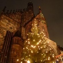 ライトアップされた教会とクリスマスの競演が美しいです。