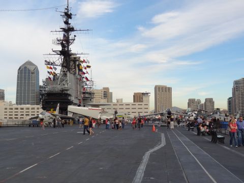 甲板の上には 多くの戦闘機・ヘリコプターが展示されており ところどころで説明会も開かれています。多くの人で賑わっています。