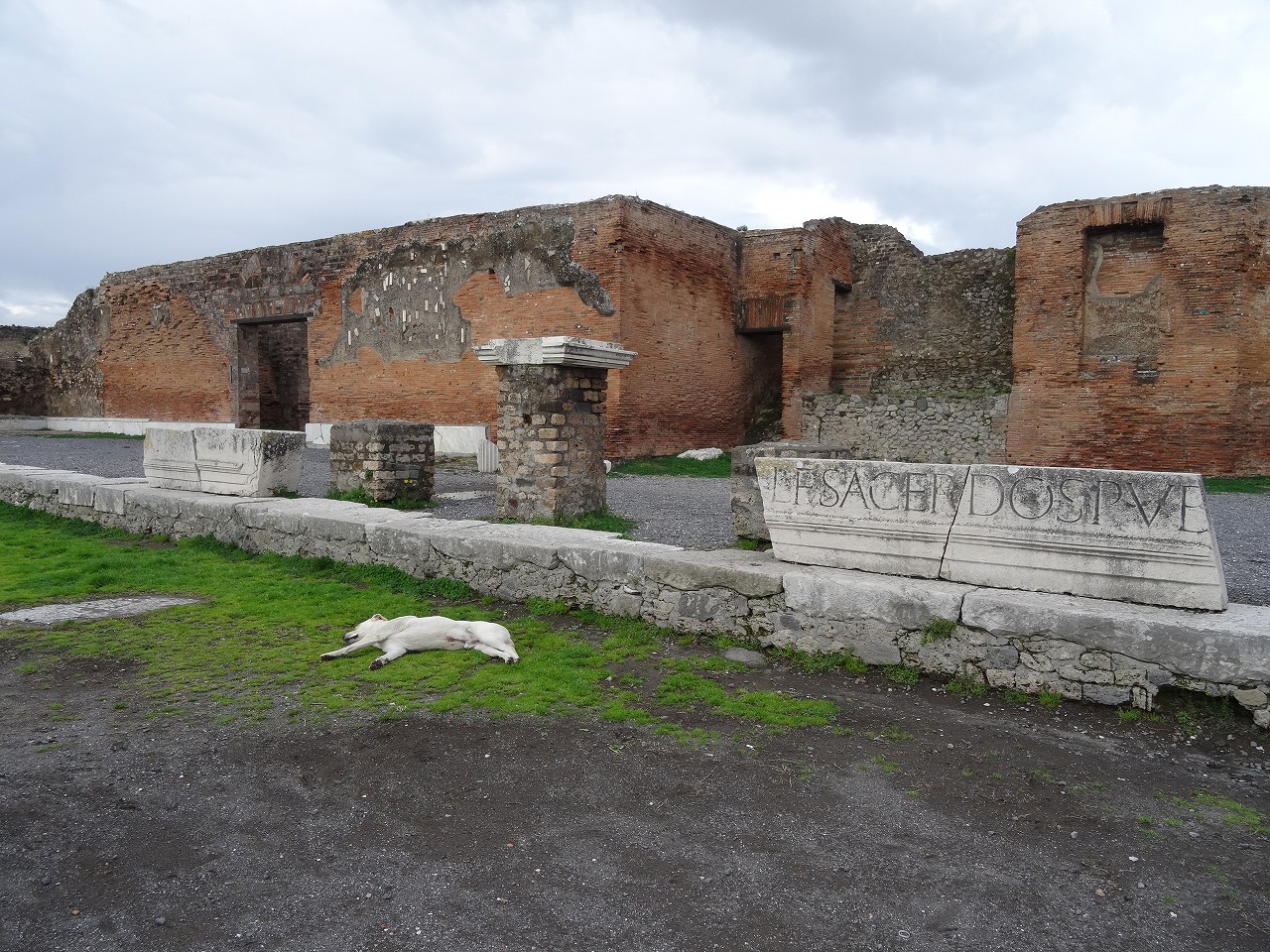 ポンペイ遺跡 ジュピター神殿はお昼寝日和でした。大きなワンちゃんが大勢の観光客など目もくれず、お昼寝三昧です。ま、しばらくはヴェスビオス火山も爆発しそうにないので、お休みなさい。遺跡の中心近くにあたります。炎天下ではたまりませんが、奇跡的にぽかぽかいい気分でした。