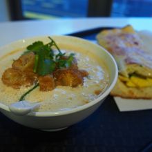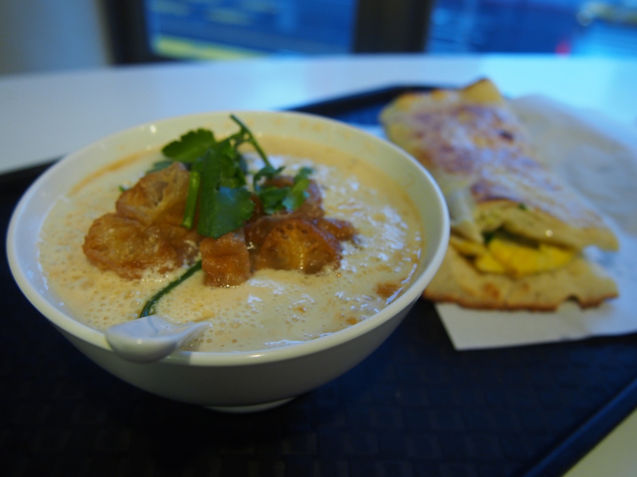 温かい豆乳(甘くない)の中にサクラエビや揚げパン、パクチーが入っています。