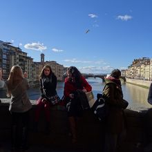 ちょうどお昼ときに、この橋の上からアルノ川を眺め、そのきらきら光る水面に感動し、夕方、また来てみて、夕焼けと周りの建物の電気の美しさにまたまた感動でした。橋の周りは、宝石店がいっぱいです。世の男性陣は、奥様や彼女の訴えるような視線に苦しそうでした。