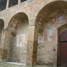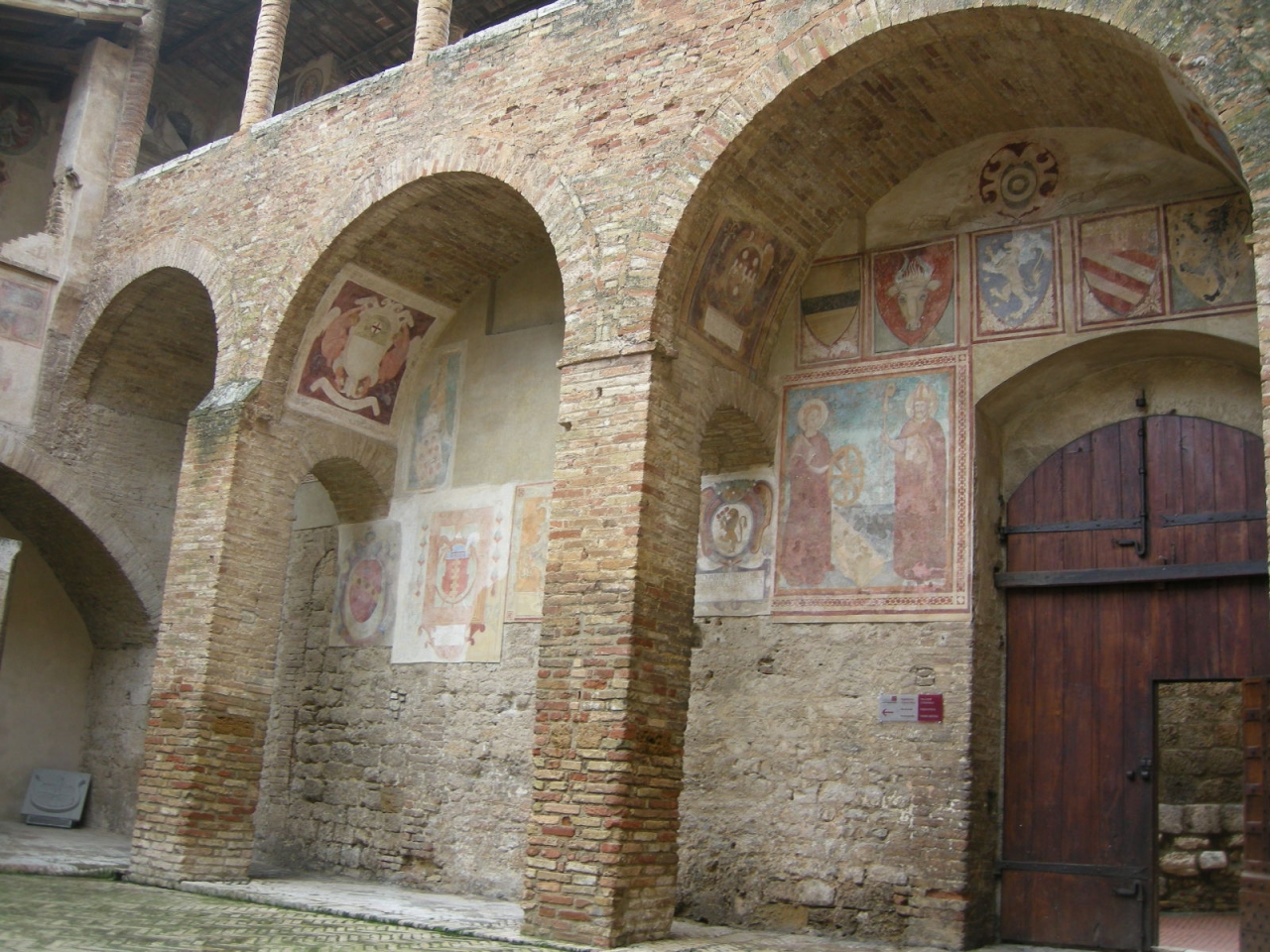 イタリア周遊団体ツアーにてサンジミニャーノを訪れました。ドゥオーモ広場の左手にあるポポロ宮は昔、政庁舎として建てられたものだそうです。現在は、市庁舎と市立美術館となっています。団体旅行なので自由時間がほとんどありません。中に入ることはできませんでしたが、中庭の壁に歴史を感じる古臭いフレスコ画がありました。