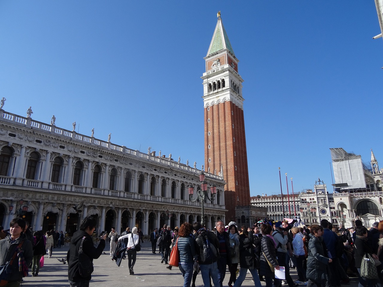 ★★鐘楼 サンマルコ広場にそびえる鐘楼です。高さ96.8メートル。エレベーターで屋上まで昇ることができます。ラグーナを一望できるということで、とても人気で、すごい行列ができていました。この鐘楼は、大運河のほうからもよく見えます。