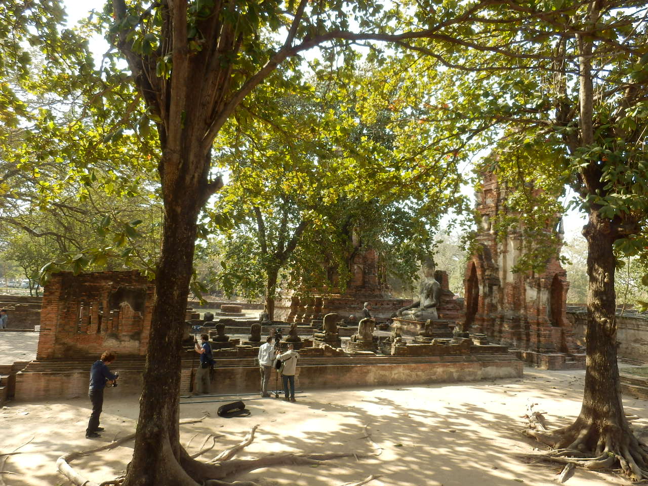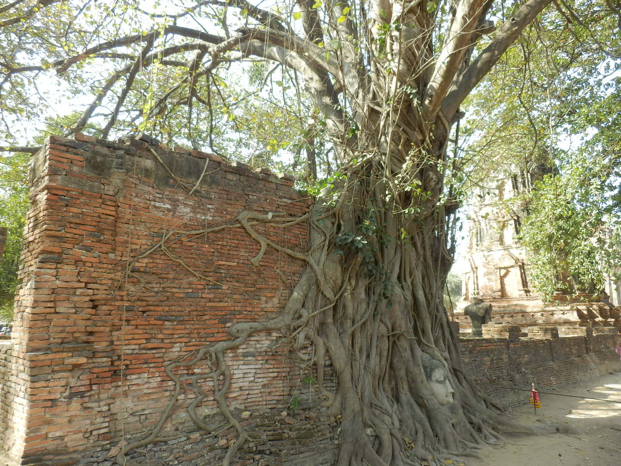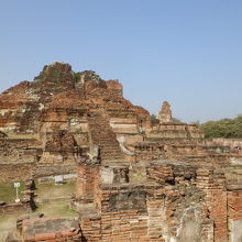 アユタヤで一番有名な観光地かもしれません。駐車場にはツアーバスや自転車が置かれ、お土産屋さんも並んでいます。有名な木の根に覆われた仏頭の周辺では人だかりが出来ていて、記念撮影の順番待ちが大変そうでした。仏頭ばかり注目されていますが、遺跡は意外と広く、奥には壊れた仏像が並び、仏塔もいくつかありました。