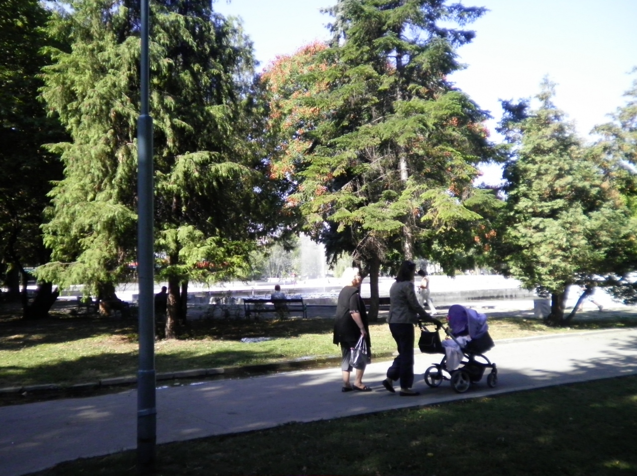 森に近い大きな木々があり、噴水もある市民憩いの場となっている。