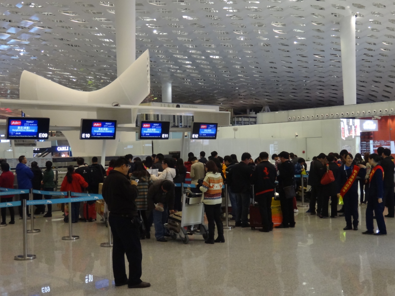 2013年の11月に新ターミナルビルがオープン。新しいのはいいのですが、かなり遠くなりました。前のターミナルは地下鉄の機場東駅から歩いても行けたのですが、新ターミナルビルへは后瑞駅からバスM416(今は無料)に乗らなければなりません。5キロほどあります。空港バスなどは当然新ターミナル発着に変更されましたが、遠くなった分、5~10分ほど余計に時間がかかります。空港内にはレストランのほか、マクドナルド・味千ラーメンなどもありますが、陸の孤島状態のせいか値段は高いです。(セットメニューで30~40元)后瑞駅周辺にもあまりお店はありませんので、安く食事を済ませたい場合はバス・地下鉄に乗る前に食べるか、買ってくることをおすすめします。到着フロアにセブン-イレブンがあり、品揃えは少ないですが、値段は市内と同じでした。
