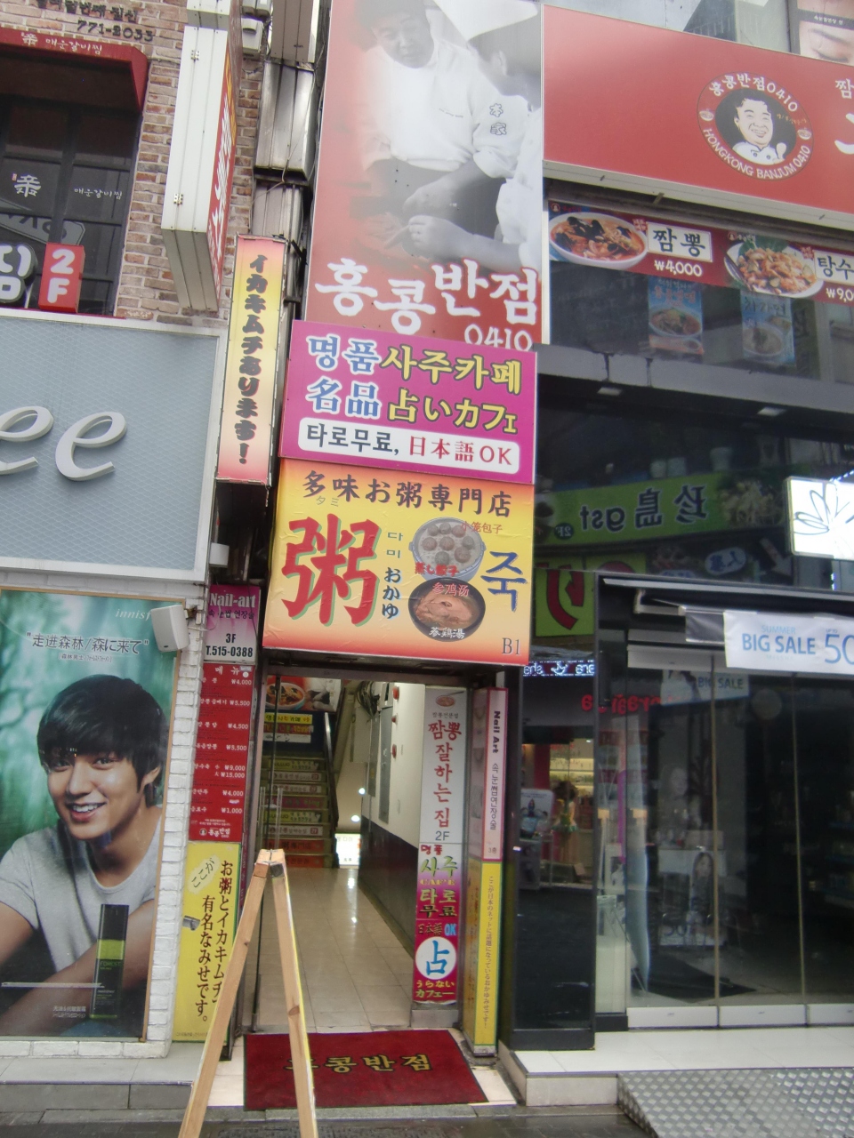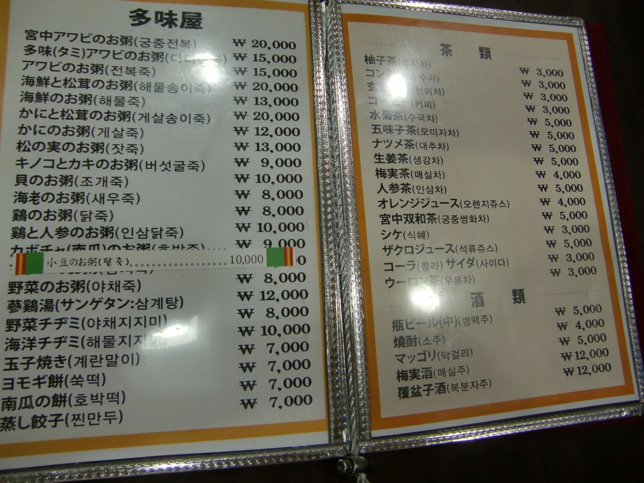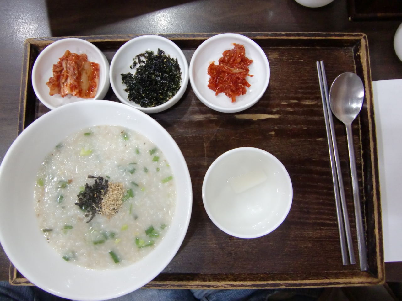 朝食に何を食べようかと明洞をぶらぶら。そこで目に入ったのが、派手な看板でした。でも結構有名みたいで、店内は日本人が多かった。アワビのお粥とかもあったけど、アワビを食べるなら「北村のイガシンガ」と決めていたので、ここでは普通のお粥にしました。