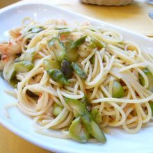 それは旬のフレッシュアスパラガスと手長エビのスパゲティ。