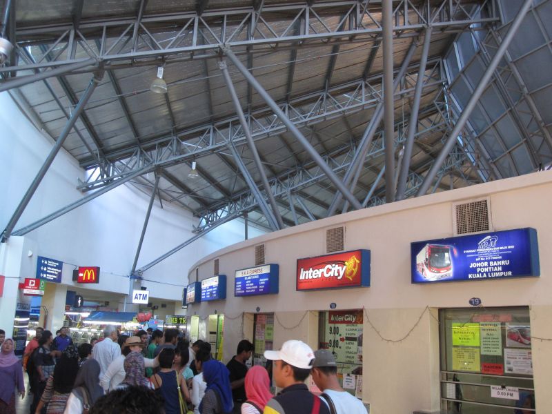 バスのチケットも、バス会社ごとにチケットカウンターが分かれているので、「行先」が決まっていても、「料金」や「次に出発する便の時間」、さらには「グレード(バスの豪華さ)」がそれぞれ違うので、特に便数の多いクアラルンプール行などは、いくつかの会社のカウンターを見比べなければならず、慣れていなければ苦労します。このカウンターや待合スペースには、小さな売店がいくつかあり、簡単な食糧(と言っても、パンやお菓子)や飲み物が調達することができます。また、屋根でつながった東隣には市場もあり、時間つぶしのあいだ立ち寄ってみても面白いかもしれません。