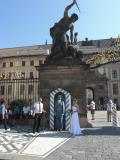 プラハ城の正門。日本のお寺なら仁王像だけど、そのポジションには棍棒と剣をふりかざす巨人。ちなみにプラハ城の建設が始まったのはなんと9世紀で世界最古で最大らしい!王の居城だけではなく宗教的な中枢としても役割があったらしい。確かに橋や門などいたるところにモチーフがある!