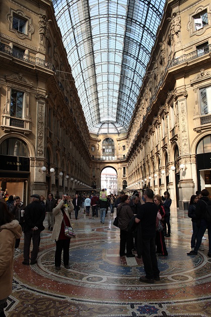 アーケードのアーチが綺麗なショッピングストリート。有名ブランドからコーヒーショップ迄、綺麗に配置されており人の集まる場所。大理石で敷き詰められた感じであったと思われる。日本人も多く、出店では日本人サッカープレーヤーのユニホームが販売されている。アーケード街の近くにはインテル、ミランのショップもある。