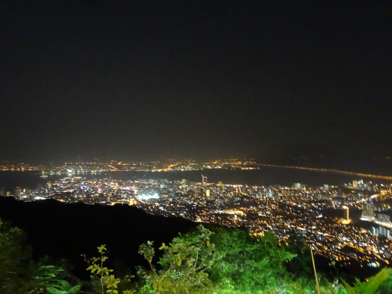 18時前に8番乗り場から204のバスに乗って行きました。帰宅ラッシュ中で道もバスの中も込んでいて1時間以上かかりました。チケット代金が15リンギットだったので片道だけしかチケットを買わなかったと家族に言われチケット売り場の人に往復なのかジェスチャーで知らせるとOKだと言われました。中に入ってケーブルカー?が来なくて20時近くになりました。登って夜景は良いです。周りに寺院とかもあるのに散策もしない、できないのは残念に思います。夜景の写真をとりすぐにおりました。帰りも204バスでコムタのバスターミナルで降りて歩いてシティテルホテルに戻るつもりでいたら運転手がペナン通りで「コムタ」と言い、良く分からずそのまま警察署の裏を過ぎても乗っていると途中でバスが止められみんな降ろされてしまいました。??でもホテルのそばだったので良かったです。