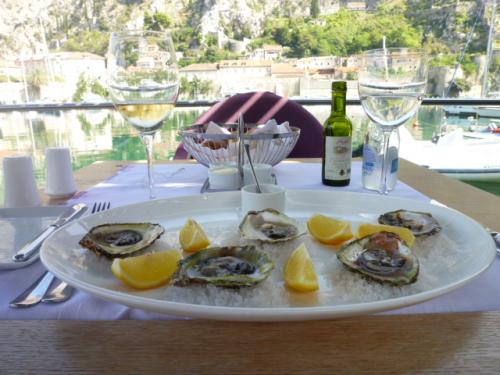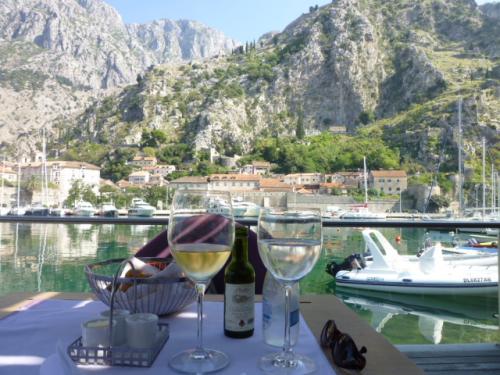 コトル旧市街や山の城壁を見渡せる絶景湖上レストラン♪