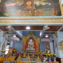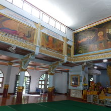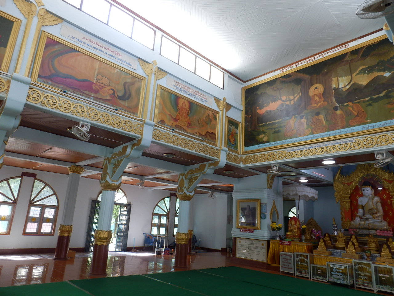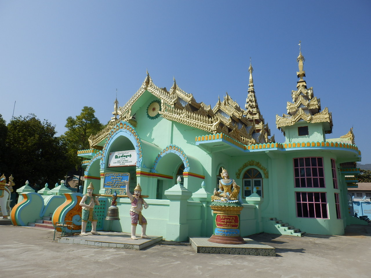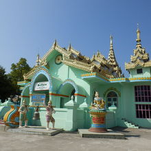 お寺ですが、なんとなく幼稚園の中に迷い込んでしまったような錯覚を覚えました。それくらい可愛らしい感じのお寺です。本堂は淡いエメラルドグリーンで、入口横にはファニーとしか表現できないような、ミャンマーらしい置物もあり、思わず笑ってしまいました。