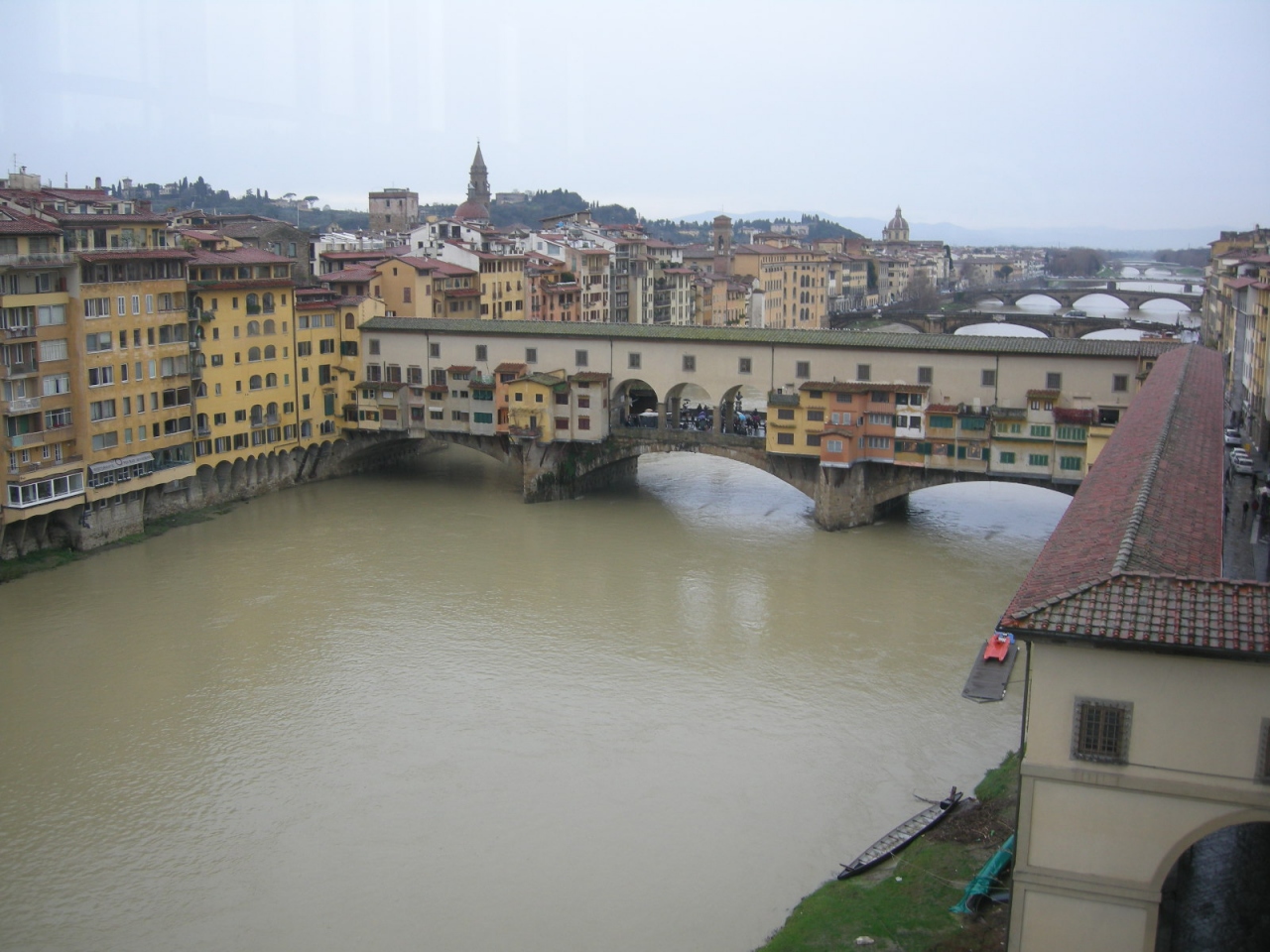 団体旅行でフィレンツェを訪れました。ウフィッツィ美術館を見学している途中で2階の回廊の窓からヴェッキオ橋を一望できました。美術館内は写真撮影禁止ですが、この場所から外の風景を撮るのはOKらしいです。実際に近くまで行ってはいないのですが、ここからの眺めだけでも十分だと思いました。