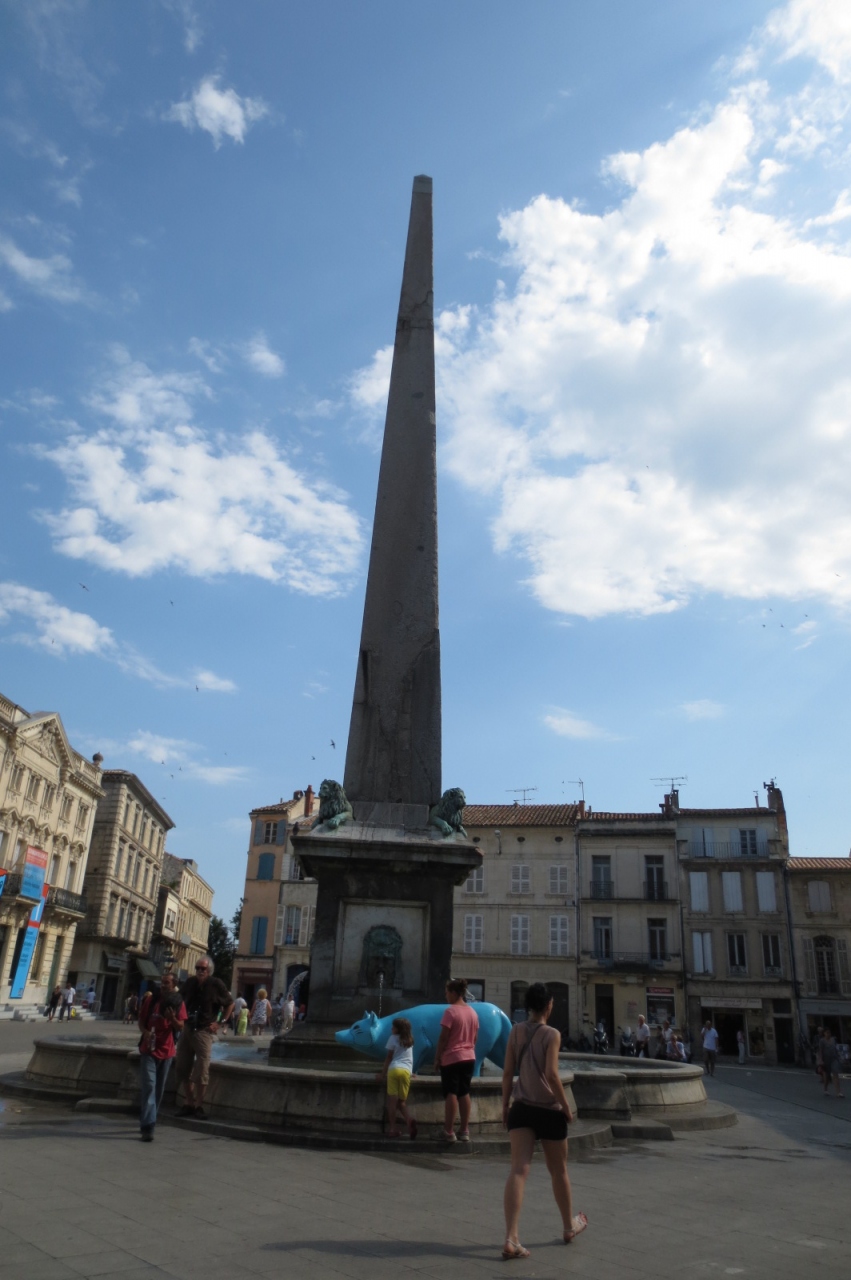 アルルの旧市街の入口のカヴァルリ門から入って、街の中心に進むとレピュブリック広場に出ます。アルルの主な観光地は、この広場の周りにあります。広場の中央には高い塔の噴水がありますが、「アルル国際フォトフェスティバル」の開催中だったため、イメージキャラクターの青い動物の人形がいました。