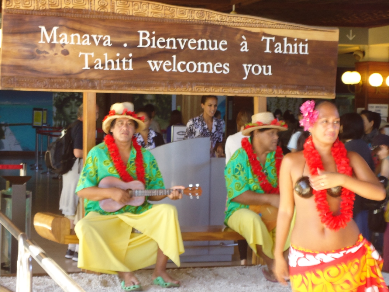 飛行機を降りるとウクレレや打楽器などの演奏と共に、美人のタヒチアンダンサーが