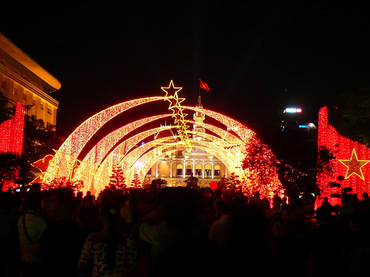 特に年末年始のイルミネーションで、この建物界隈がベトナム国旗の色の赤い光のアーチで彩られていたのはとてもきれいでした