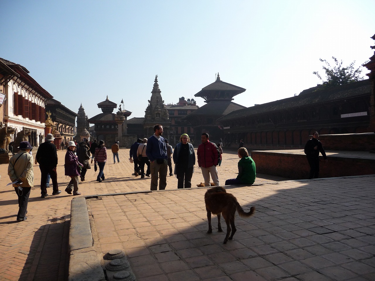 ダルバール広場 (Bhaktapur Durbar Square)カトマンズなどと比べ、広々としています。北側には、王宮の入口もあり、赤茶色の煉瓦の建物と強烈な日差しのもと、のんびりと山羊がお供えの花を食べるすがたが印象的です。広場を見渡す、テラス席のカフェでのんぶり時間をすごしたくなります。