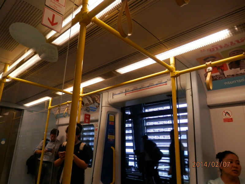 つかまる持ち手の黄色いバーが息苦しくなりそうなほど。車内の空間に棒が混み合う設置の仕方。