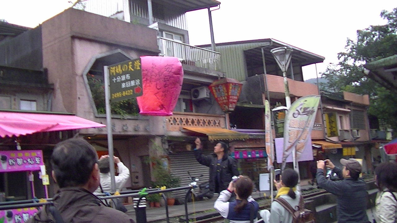 今回、個人的にはこの天燈上げがメインの観光でした。ツアーで行ったため、4人に一つの天燈が割り当てられ、墨字で願い事を書いて大空に上げます!意外に大きな天燈は一気に上昇して行きます。見えなくなるまで目で追って・・・何か幸福感を味わえる一時でした。天燈自体は意外に安く一つNT$150=約500円線路脇で上げるので、たまに電車が通ります。