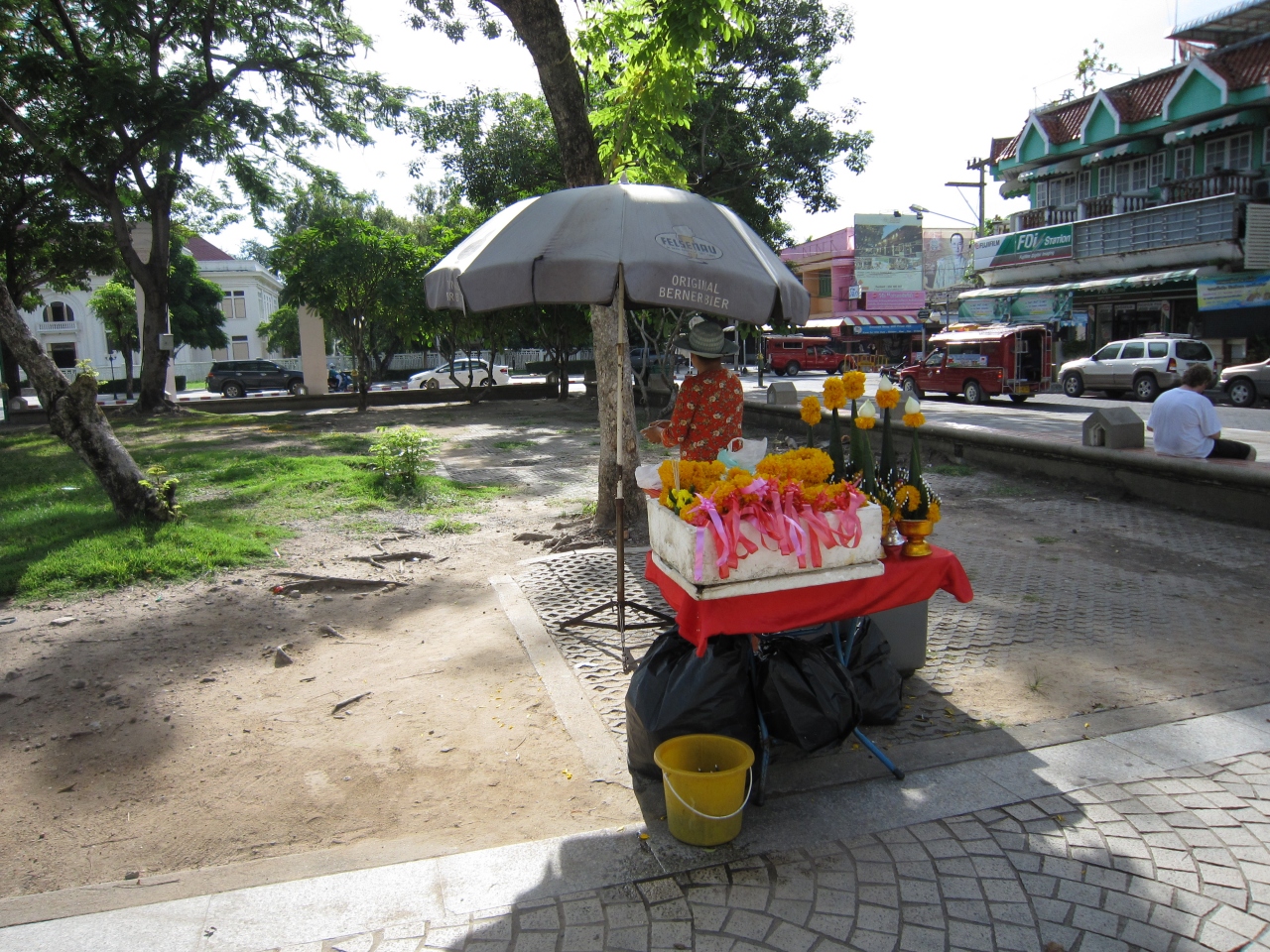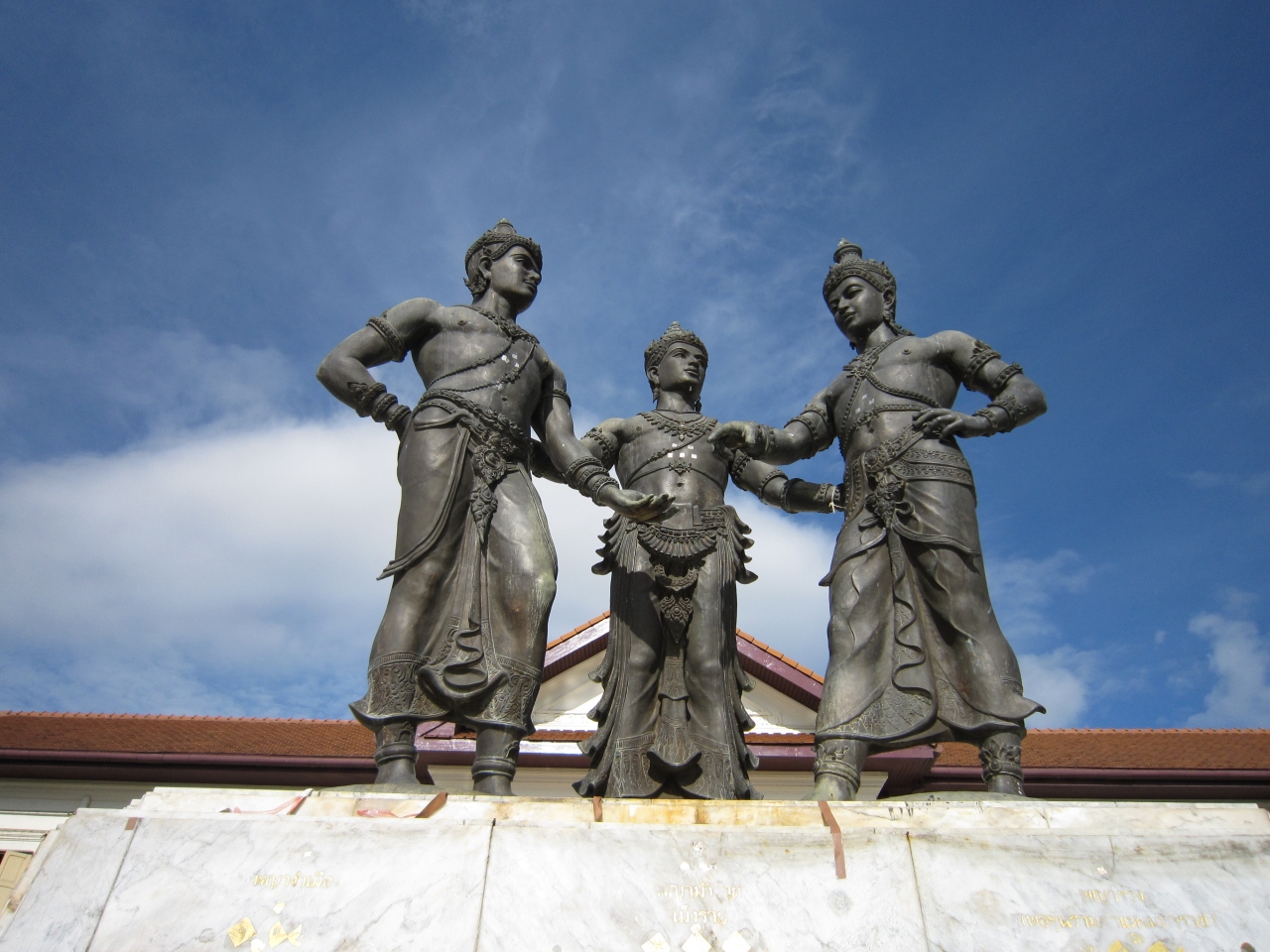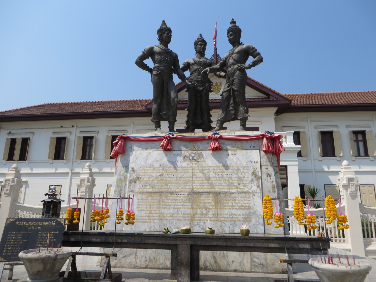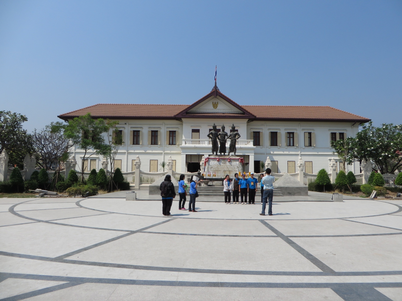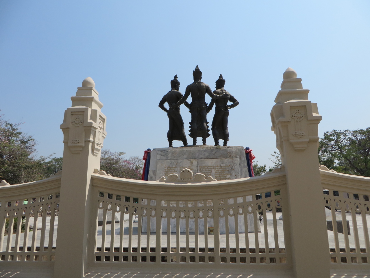 チェンマイ市芸術文化センター前の広場に建っています。旧市内をぶらぶら歩き広い広場前に着きました。チェンマイ建設ゆかりの王、中央がチェンマイ王朝のマンラーイ王、左はパヤオ王国のカムムアン王、右はスコーター王国のラームカムヘーン王、チェンマイ王国の建国、町の建設に協力、3王が協力を誓い合っている様子を表しているそうです。この像の説明書はタイ語のみでどう説明しているか分かりません。観光客が記念写真を撮っていました。広場は広いです。お祭りの時は広場前は賑うそうですが普段は静かです。後はチェンマイ市芸術文化センターです。このセンターを見学後、この像の前で記念撮影をする人が多いようです。