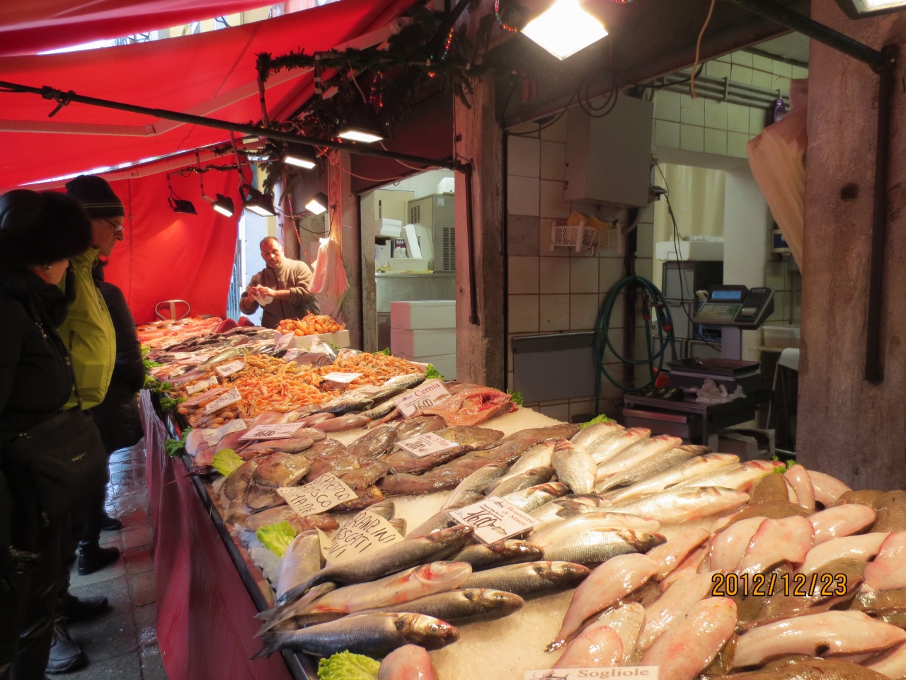 魚市場はサンマルコ広場からは少し離れた位置にあります。ヴェネチアの中心は十分歩いて観光ができるので、魚市場も歩いて行ける距離です。午前中は沢山の屋台が出ており、新鮮な魚介類が沢山あり、ただ観ているだけでも楽しくなる場所でした。