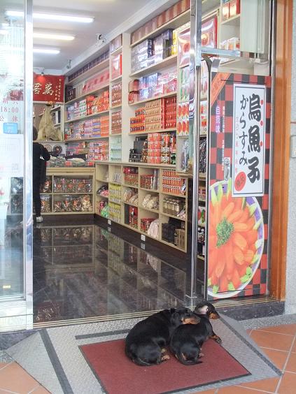 カラスミを求めて伺いました。旅行誌の地図を頼りに到着した所は何となく雰囲気が???店名は同じですが何か違う感じ。よくある事なのか、私達に気付いた店主らしき人が出てきて教えてくれました。カラスミを扱っているのは同じ通りの少し北側。可愛い犬が入口に2匹、店内に1匹いました。