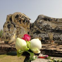 雨にも負けず、風邪にも負けず、外に堂々と布をまとい寝転んでいる涅槃仏。個人的に寝ていいる涅槃仏が好きなため、ここで癒されました。蓮の花と金粉のお供え物を購入し、お願いごとをしましたが、少しその場を離れた際にお供えしていたお花はすべて撤収されていて少し残念に思いました。